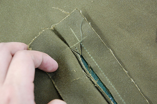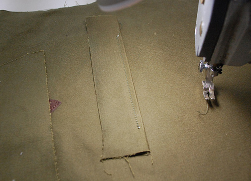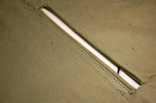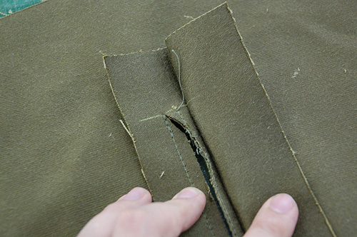 ちょうど、身頃本体のポケット穴位置と、口布を同じ位置を合わせて縫っていることになります。