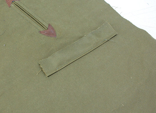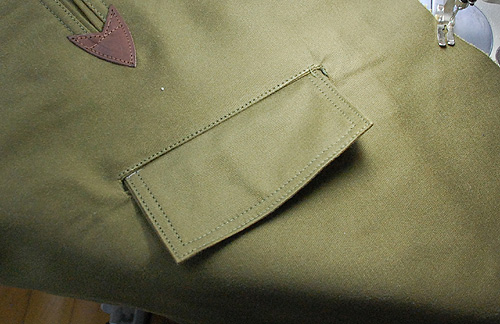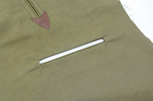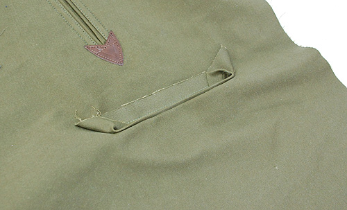 通常、両玉もしくは片玉が多いですが、この手のコートにはフラップが挟まれる部分に、半分だけ玉がついたポケットが良く使われています。