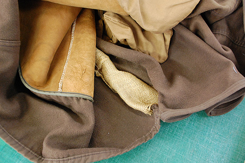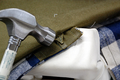 そんな時は、アイロンを十分にするだけでは足りず、このようなトンカチでたたいて、厚みを軽減するとともに、ある程度、組織をやわらかくします。