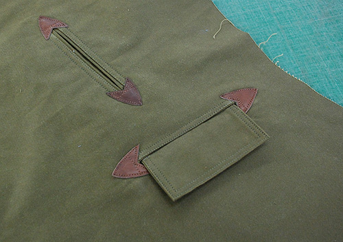 本来は、先ほどの縦の部分にもステッチが入るのですが、今回の仕様では、ポケットぐちの端部分は革で補強されカバーされてしまうので縦ステッチは入っていません。