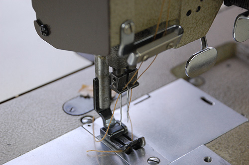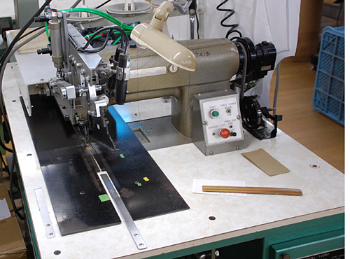 ただ、ファーストサンプルを作った時にはちょうど、そのミシンが他の用途に使われていたので普通の一本針ミシン、これをガイドをつけて二度縫いしています。 |
