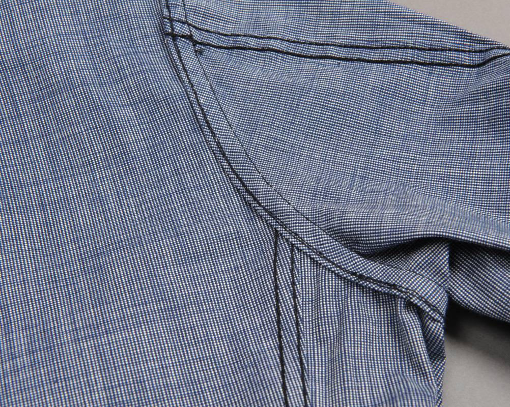 パイピング始末と最後まで悩みましたが、やはりラフな雰囲気を残したい。しかし、折り伏せのチェーンダブルステッチだと、もろにワークウェアな雰囲気になってしまうので、折り伏せ縫い、押さえシングルステッチ始末にしました。