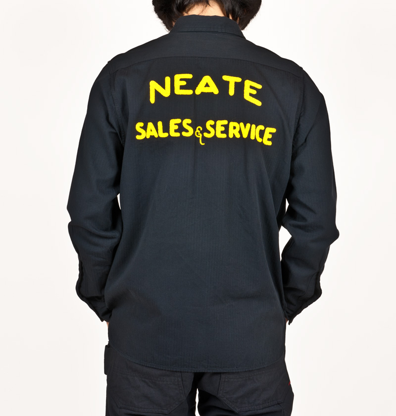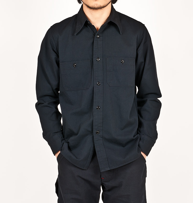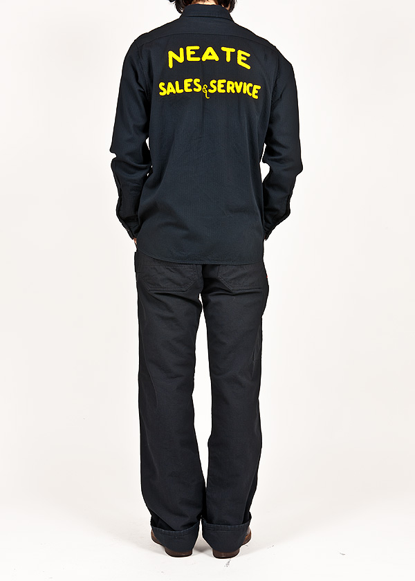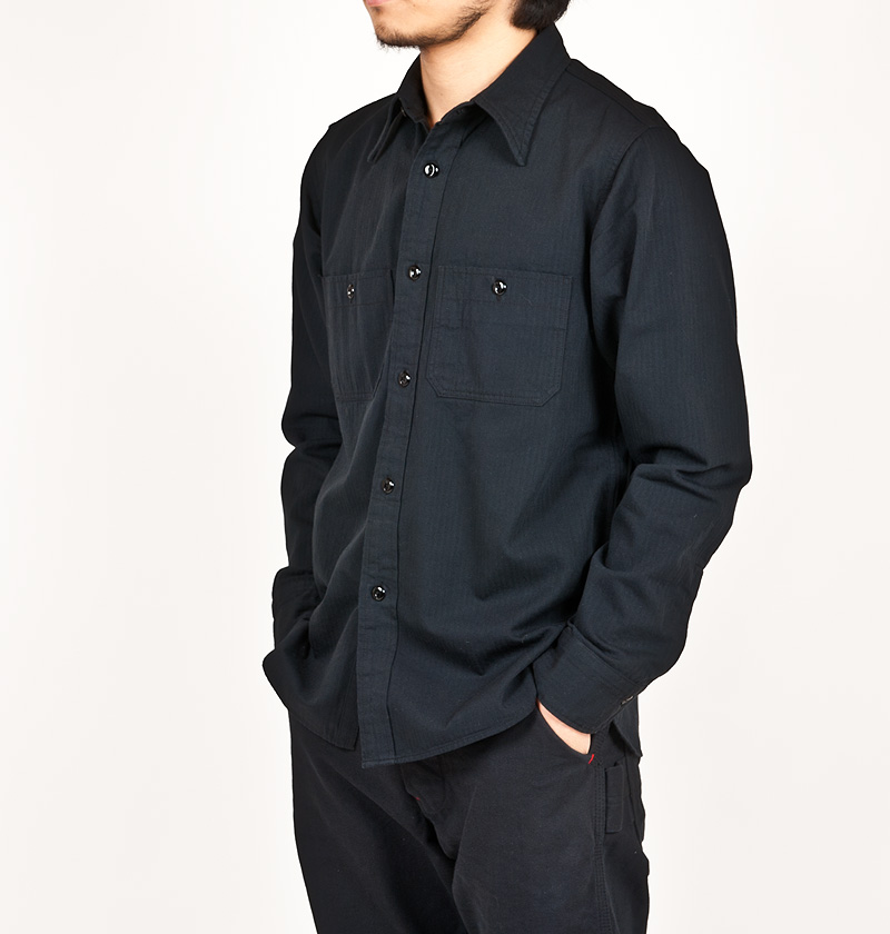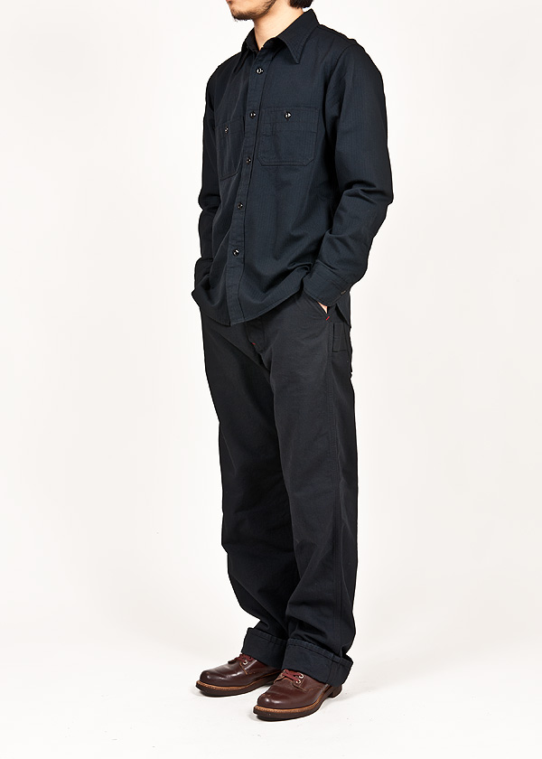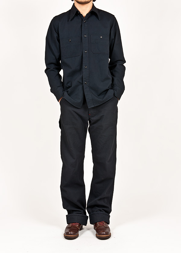 ブラックのワークシャツ。オールブラックはちょっときざですが、素材がラフというか野暮なので適度にこなれていると思います。