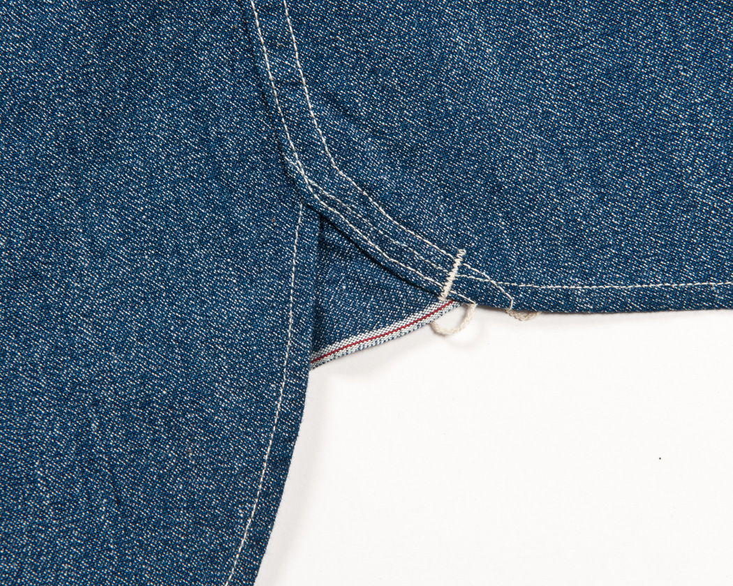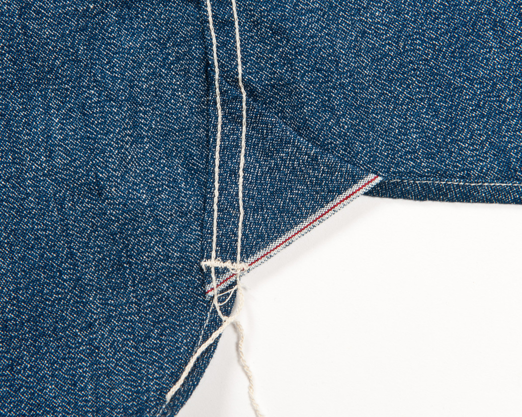 脇には二つ折りした生地を挟み込み、マチにしています。チェーンステッチで上から下に向かい、逃がすように縫い、最後はカンヌキで止めてほつれ止めとしています。