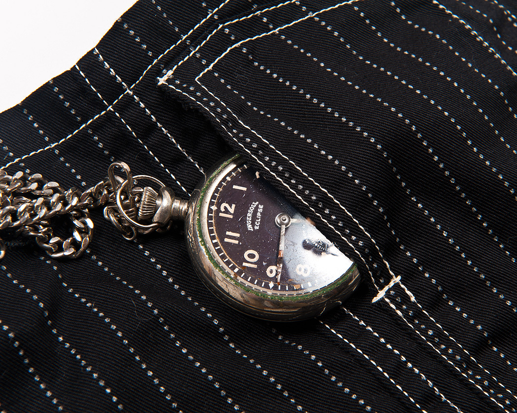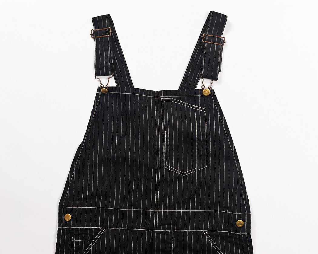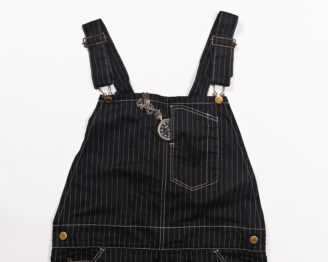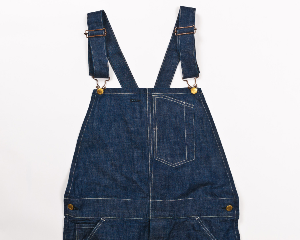オーバーオールのビブ。 レイルロードジャケットと同じ、6角形のウォッチ&ペンシルポケット。 ビブの右側にはホールが開けられ、懐中時計のチェーンがひっかけられるようになっています。
