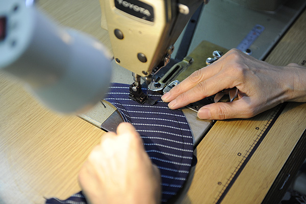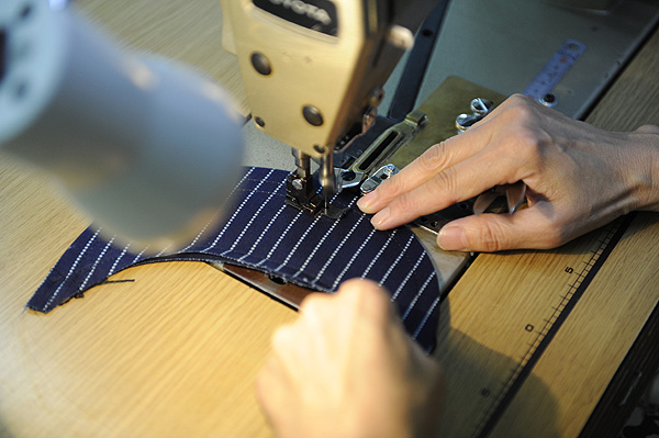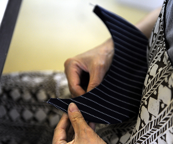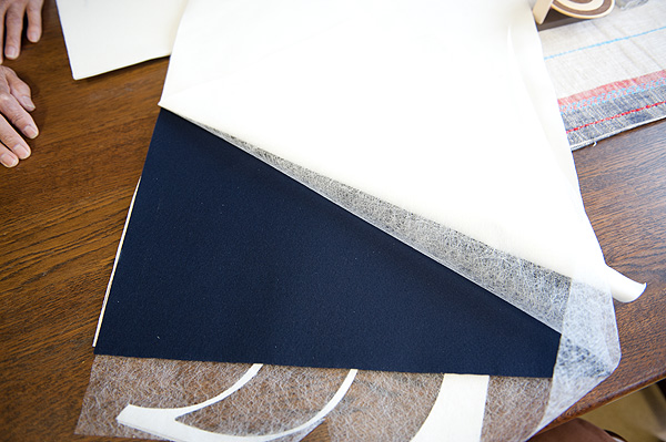 このジレンマを解消するため、三層構造で適度な硬さ、厚みを出し、さらに芯も水溶性にする事で洗った後には接着部分が取れ、キャンバス・フェルトの間にはごく薄い生地が残るだけの状態になります。