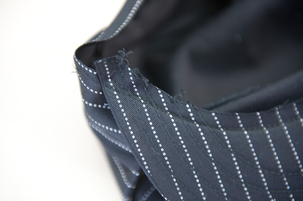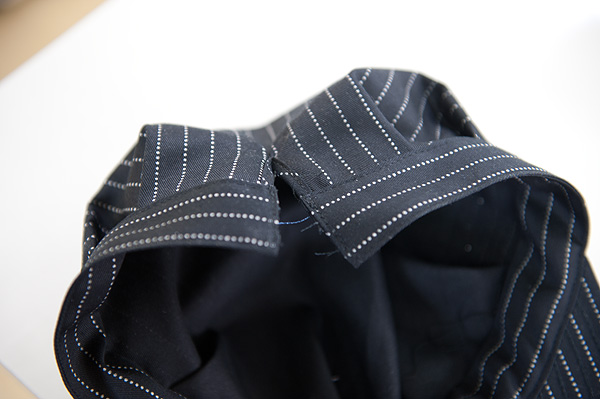 後ろ中心のパイピング部分。その突端は、ほつれ止めの為縫われているのですが、ここの縫い具合もおばちゃんいわく「一目だな、一目・・・」「じゃ」(こっちは会長)と、二人でうなづき合ってました。