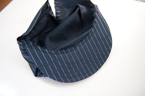 逆に、ここでどうにもうまくいかないと言う事は、帽体のつまみ、バンドの地縫い、バンドの押えステッチ、これらの精度が悪いと言う事なのでもう、どうやっても綺麗に仕上がりません。