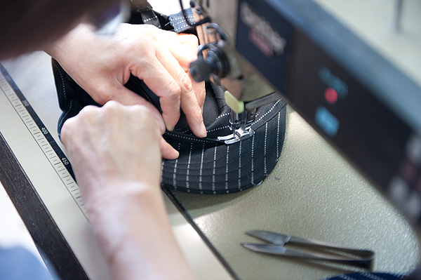 始末が終わってひとまず完成。この段階でまず一度検査。これから、後ろにベルトを付け、ハトメを打ち、不要な糸を切り再度検査に回ります。