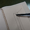 まずは、その描き直しの一番手、襟です。いわゆるテーラードジャケットの裏襟作図法で描いています。小ぶりかつ、開きは90度より少し小さめの角度。