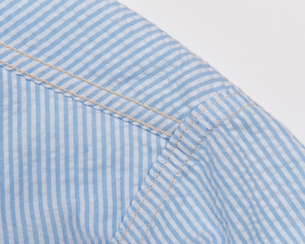 ボタンダウンの袖ぐり伏せ縫い同様、寸法差からでる皺もこの製品「らしさ」を強調しています。