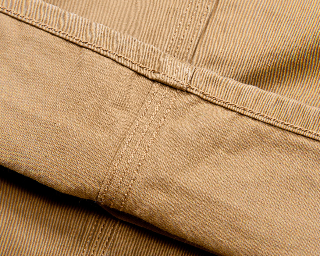 脇・内股共にチェーンステッチ。やはり5/16のトリプルという、幅が広くワークパンツで良く使われるミシンです。