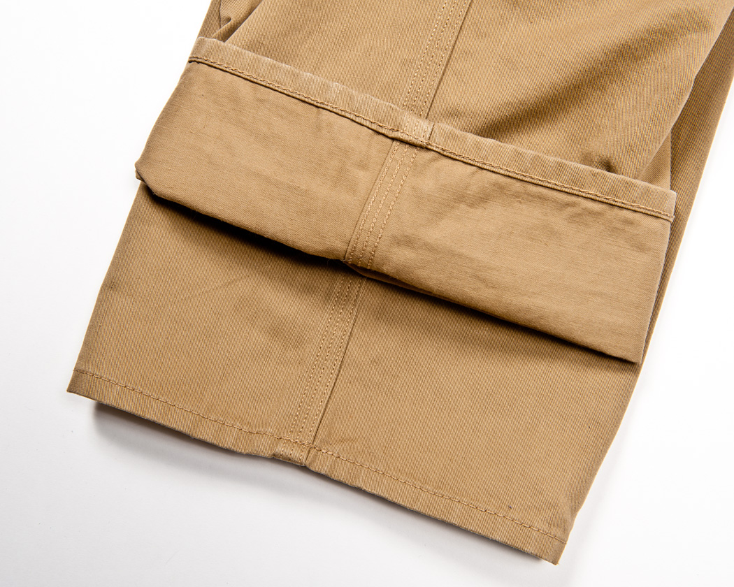 今回はそのイメージを活かし、太めの巻き縫いでチノ素材を使う事で、Work Chinoの名の通り、ワークウェアとチノパンの雰囲気を融合しようとしています。