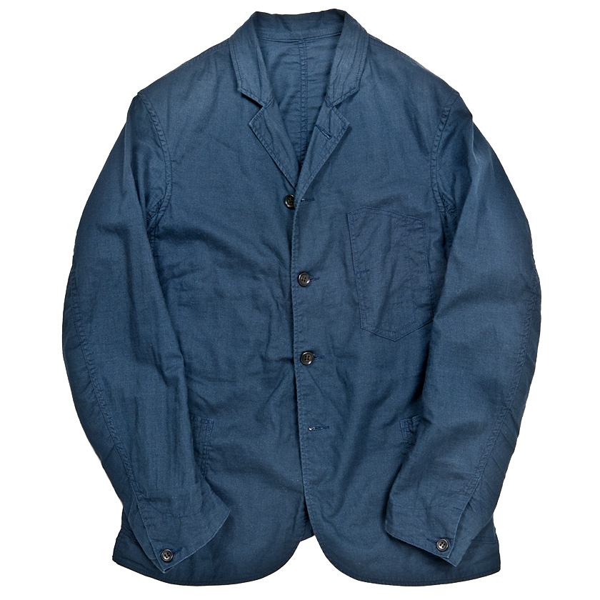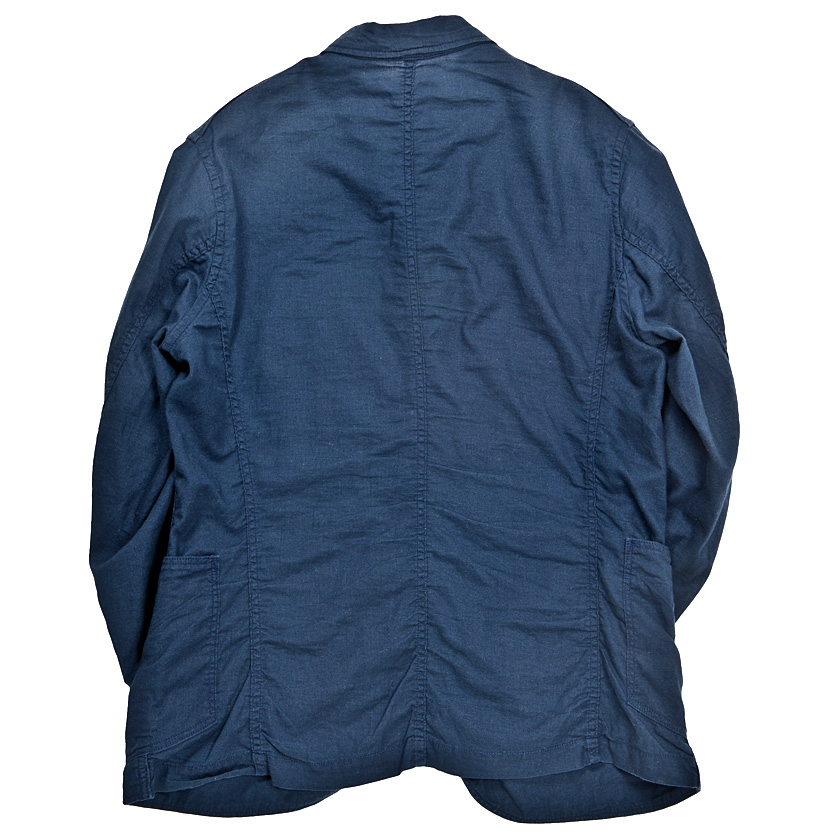 単なるジャケットではつまらないので、デザインはレイルロードジャケットを取り入れ、素材は綿・麻を繊維の段階で混ぜ、糸にして織りあげた生地を使いました。麻独特のハリがありながら、チクチクせず、糸も自然なムラがでています。