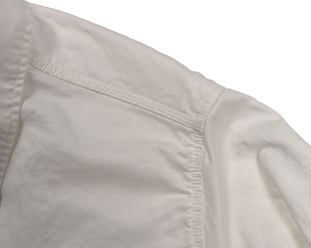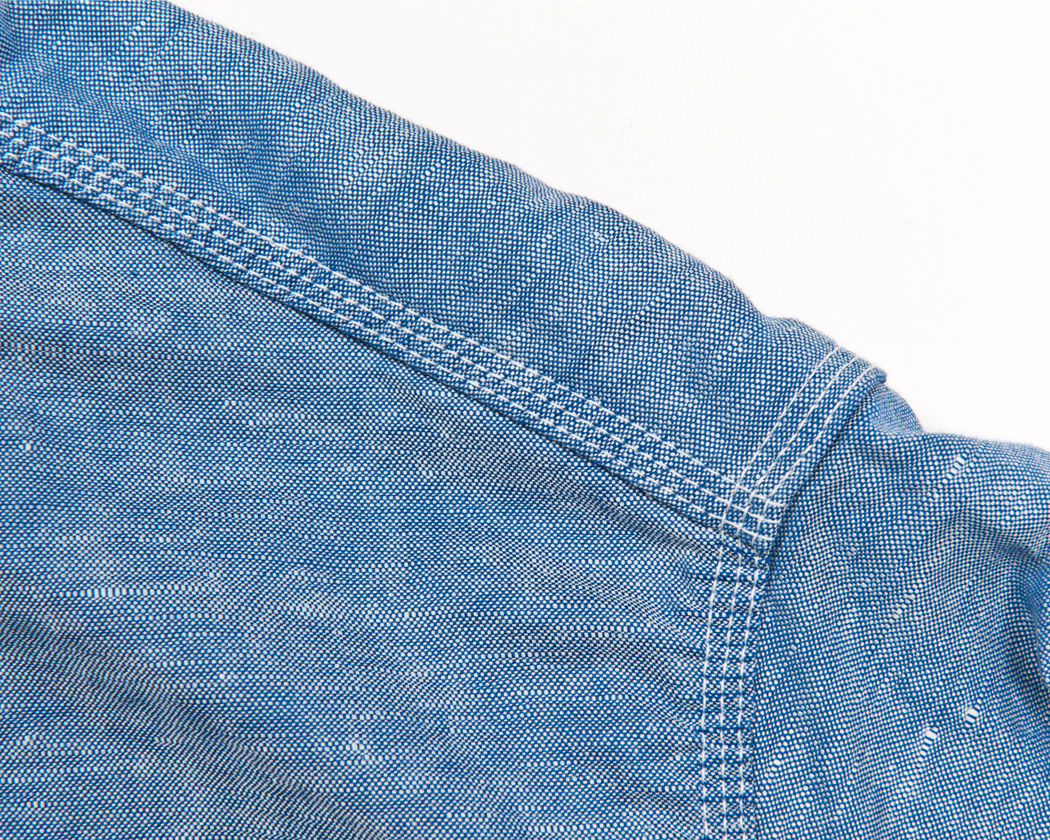 肩・袖ぐりのハギは3/16インチ、細めのトリプルステッチ。