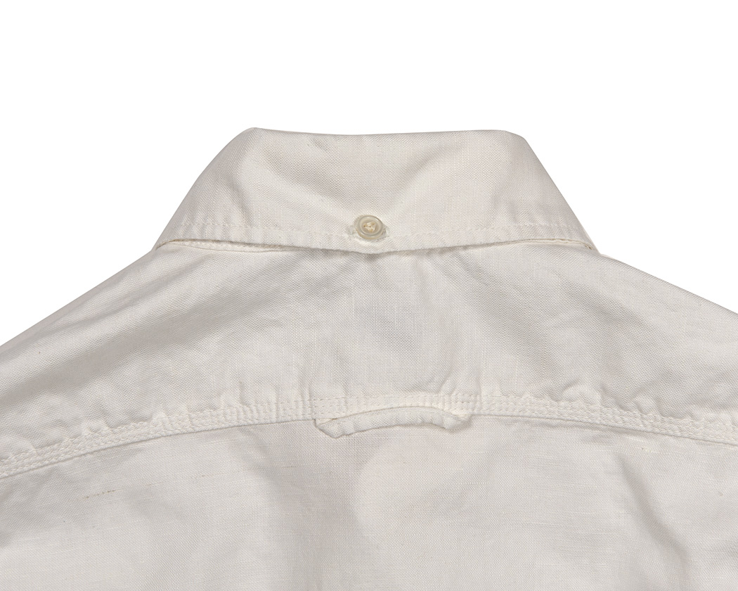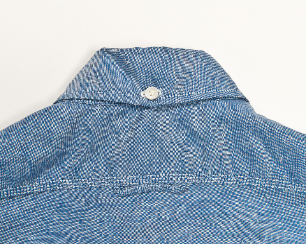 羽襟のボタンどめ、ヨークのセンターにはハンガーループ。羽襟ボタン止め無くとも良いのですが、お約束のディテールとして盛り込んでいます。