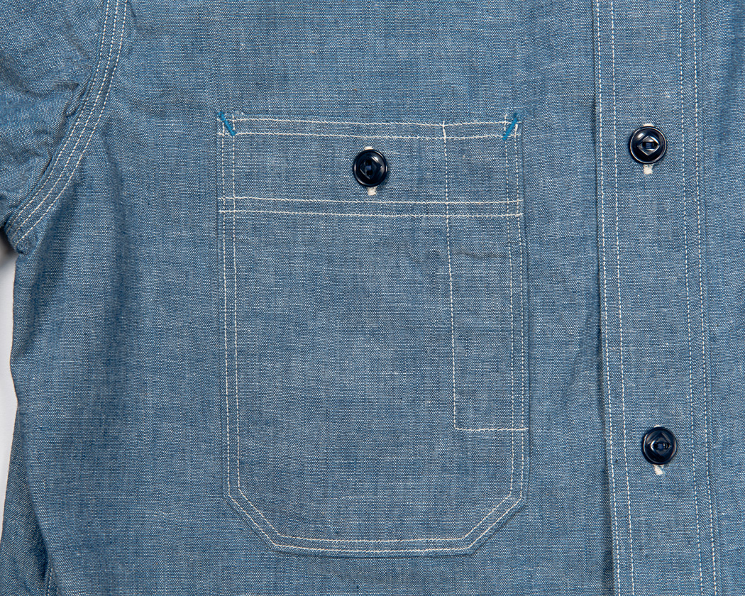 右胸ポケットは縦長の6角形。ペン刺しが別生地でポケット本体のみに付けられています。