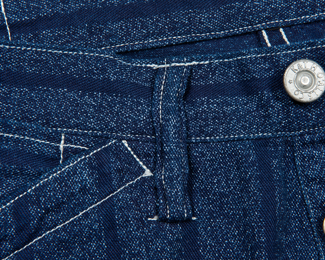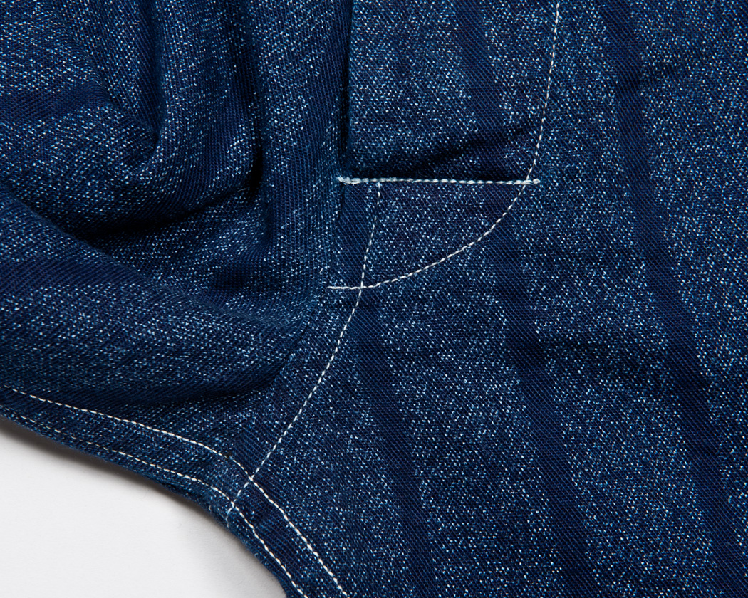 カンヌキミシンの無いラインで縫ったウェスト丈のオーバーオールを目指しています。ステッチもあまり太くない30番糸をメインに使い、目を細かくする事で古臭い雰囲気が出ています。ただ、これは無理に出そうとしているより、細い綿糸で強度を出すには目数を多くせざるを得ないからです。