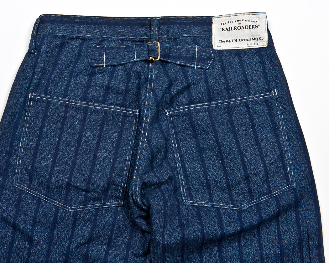 バックはヨーク無し。いかにもオーバーオールについていそうな尾錠の形。後ろポケットは全体に5ミリ程度の細めのダブルステッチで仕上げています。