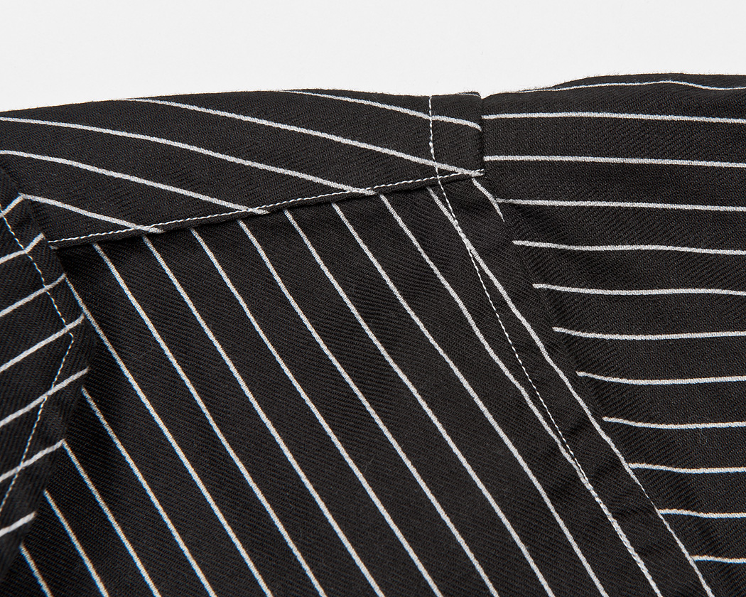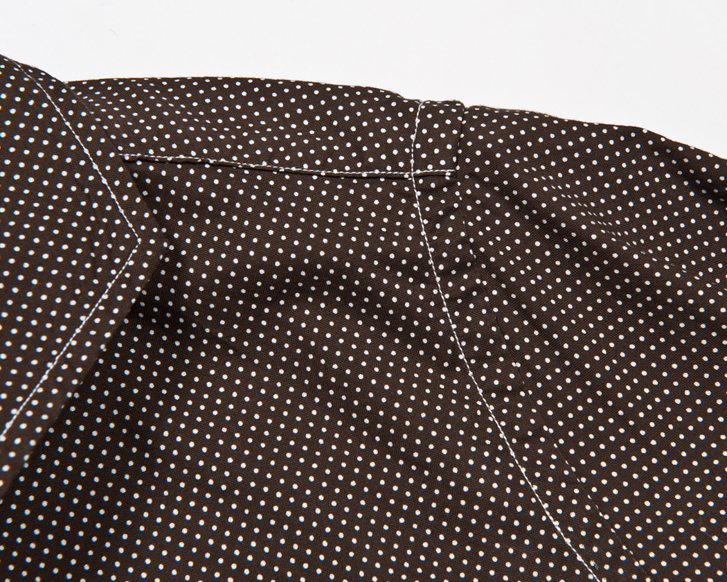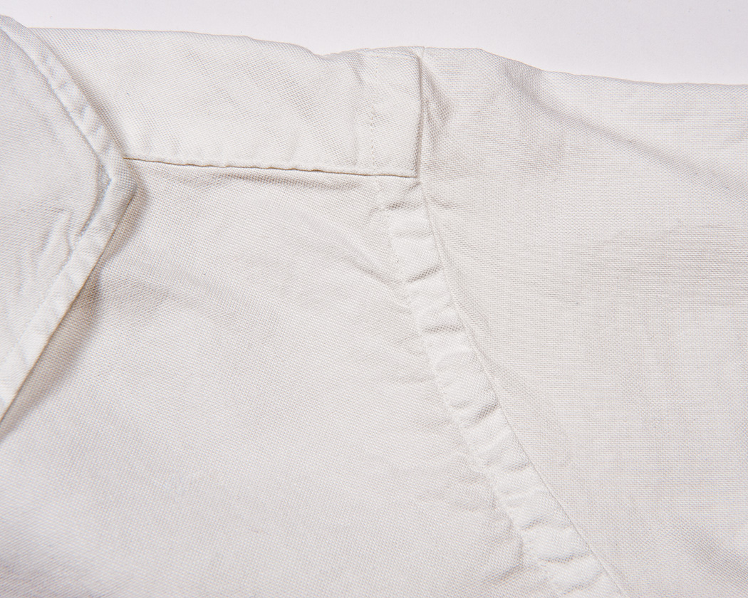 袖ぐりは織り伏せ縫い。オリジナルはチェーンステッチの巻き縫いでしたが、折り伏せのほうが1枚分厚みを減らす事も出来、また袖ぐりを細くする事も出来るので仕様を変えています。