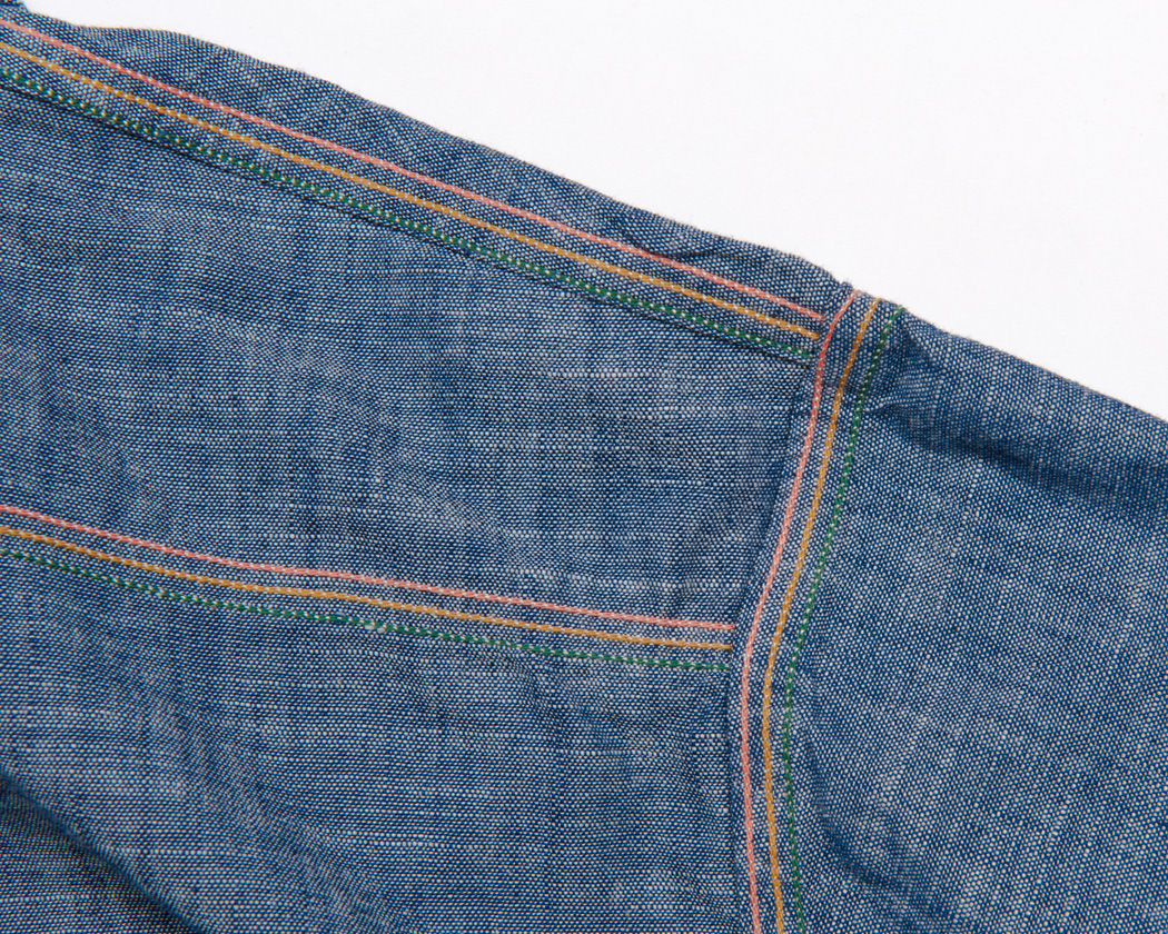 下糸には三色別色を。これも、昔のワークウェアで「下糸なんて何でも良いだろう」と適当にかけられているところからです。工場で自由に糸を選んでもらったらとてもかわいい糸使いになりました。