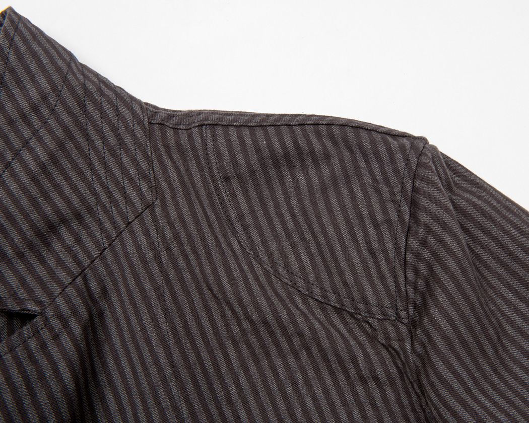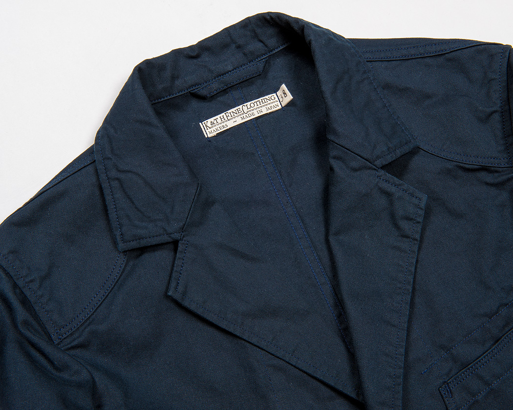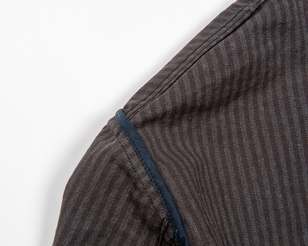 今まで、一重のジャケットはワークウェアの延長ということではさみ襟で始末していましたが、今回はあくまでLounge Jacket。ジャケットらしさがラペル周りにも必要なので、割に変更しました。