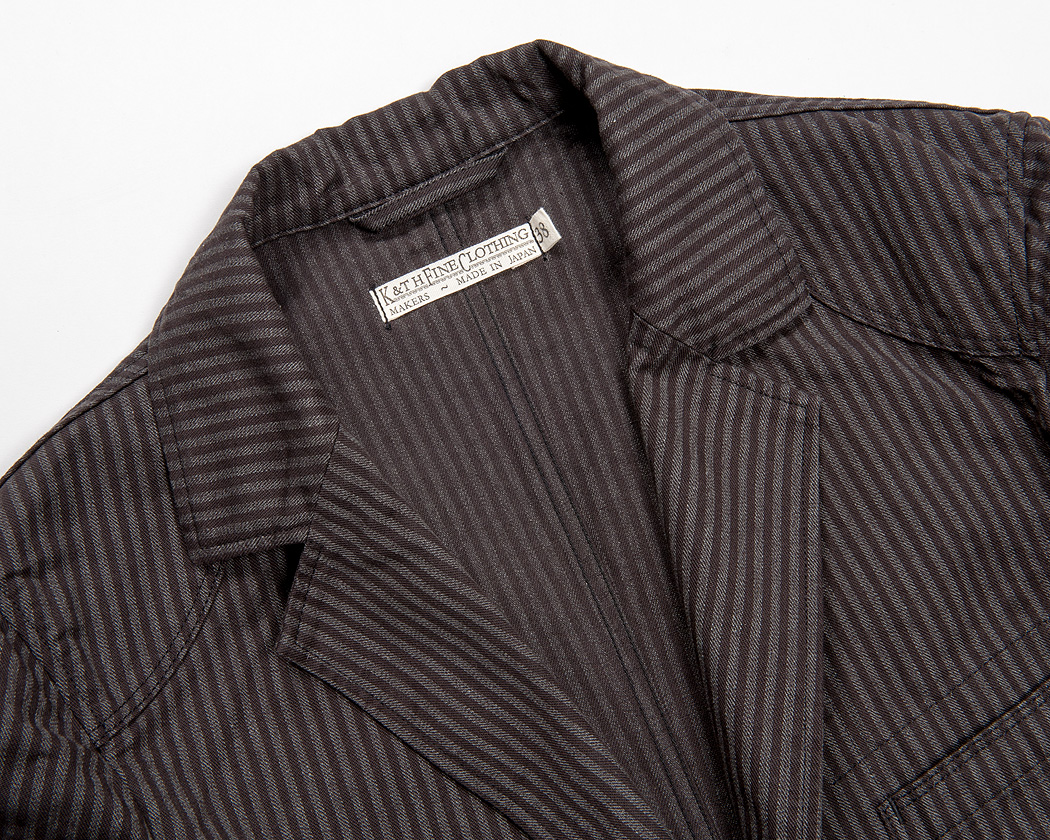 襟首にはクロージングにつけいているK&T H FINE CLOTHINGラベルとベルトループで襟吊りを挟んでいます。