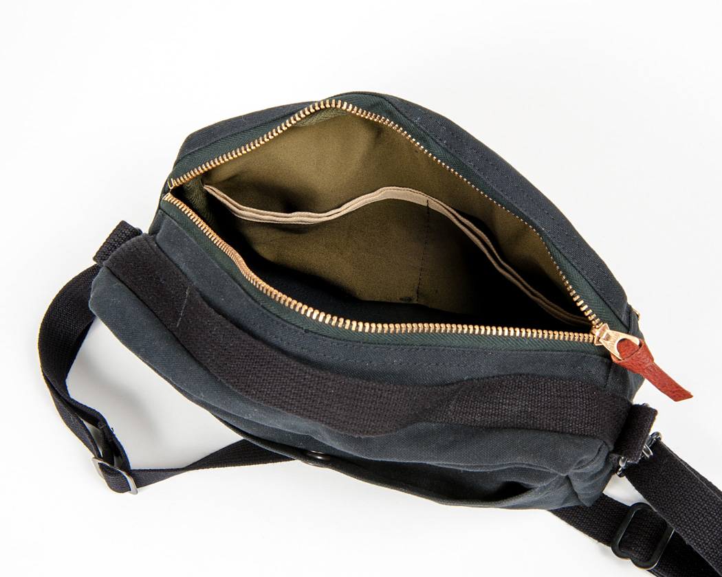 本体の中には仕切りがあり、3室。ここは、少し薄めの生地で作り、やはり断ち端はパイピングしています。