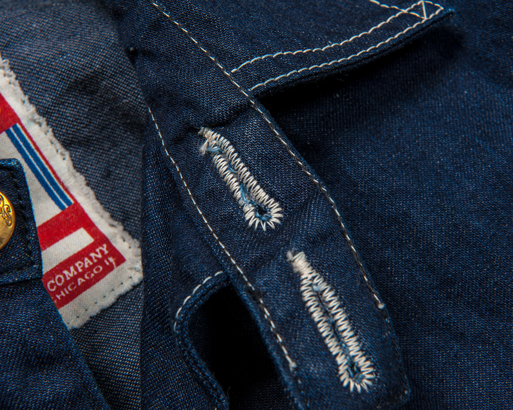 一枚ものの直線的な襟。襟周りは2本針ミシンで縫うことで、角角に「チョウチョ」と呼ばれる、独特な糸の飛ばしが出ています。