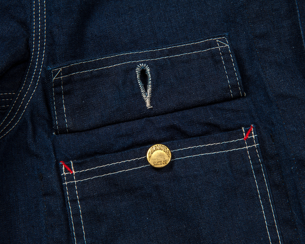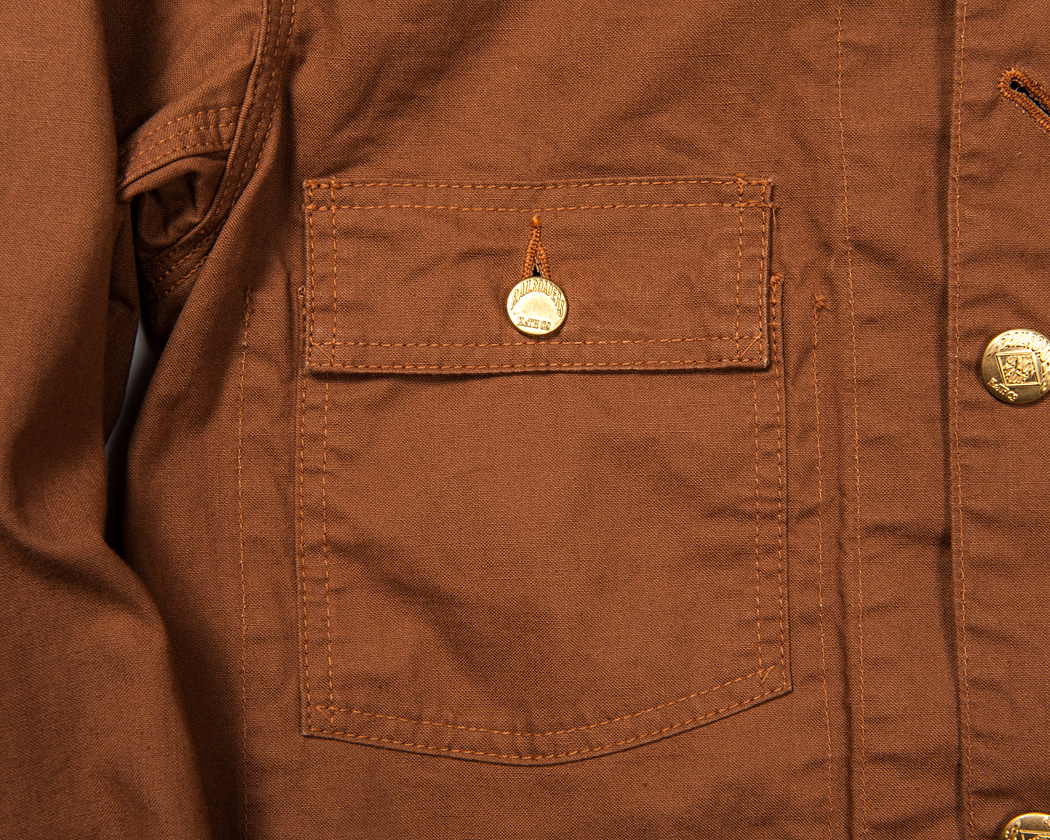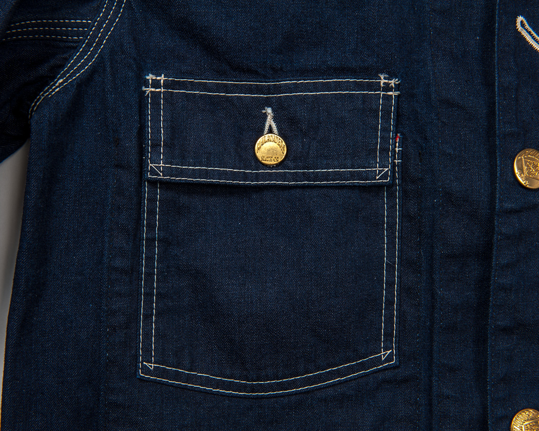 右胸ポケットはフラップ付き。ポケット本体は単なる五角形ではなく、ミシンを止めずに縫えるように微妙なカーブにしています。