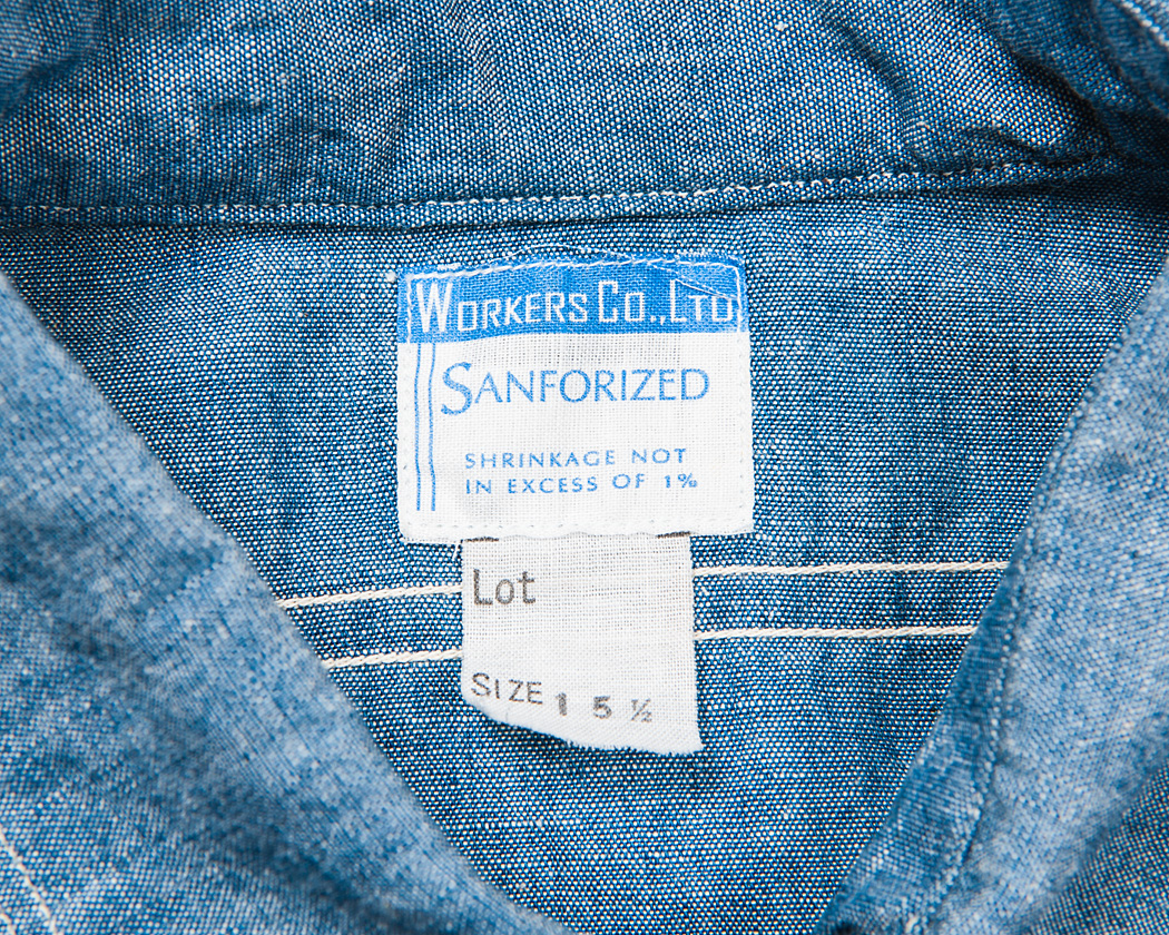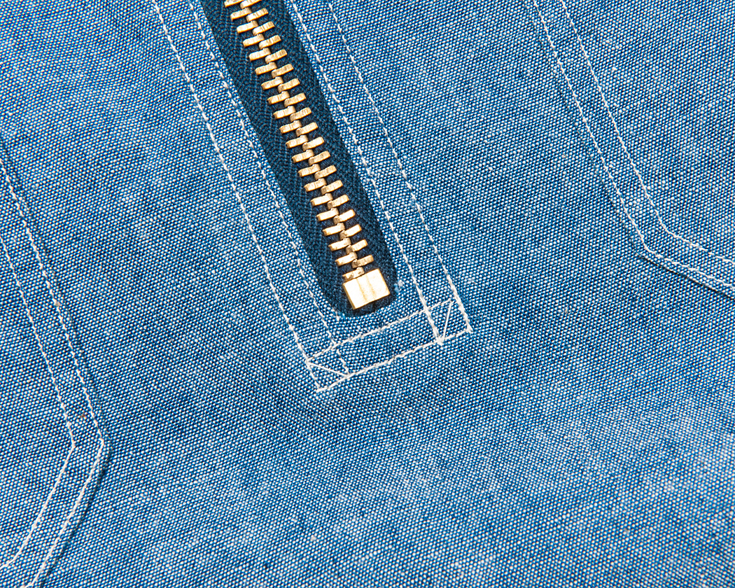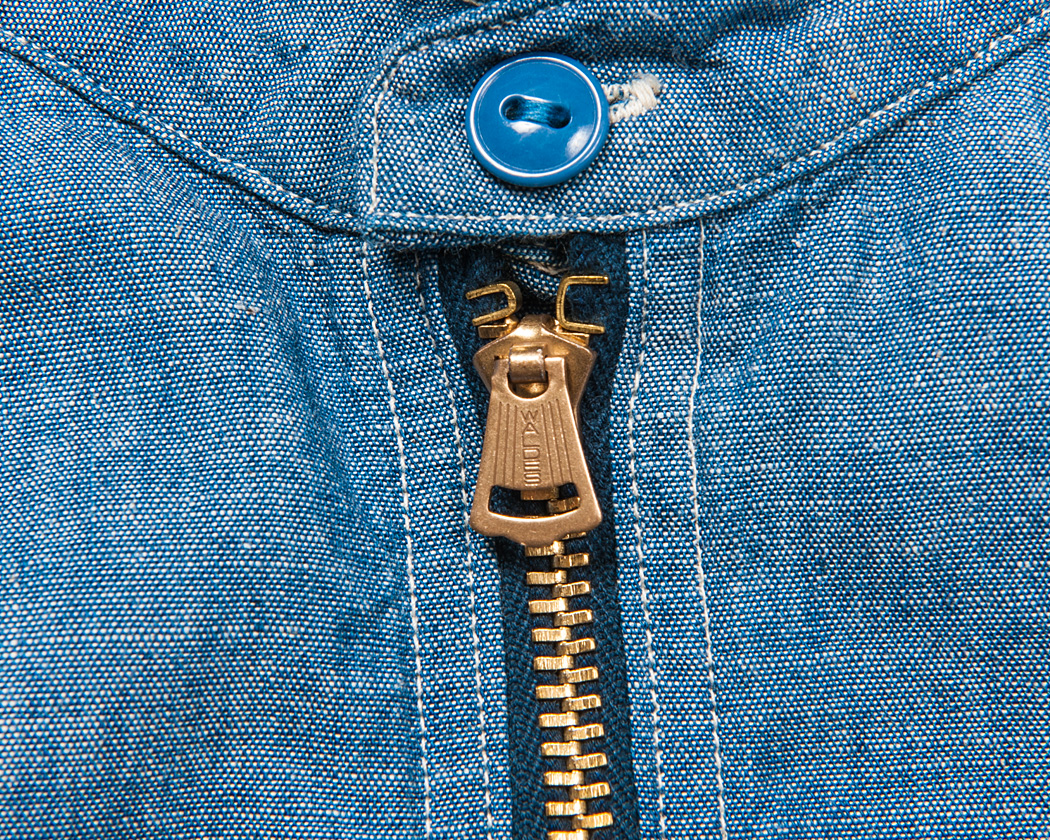 トップの止めはもちろんビンテージよろしくコ止めです。ファスナーテープも綿。このシャツ・このジッパー引き手の形にふさわしい仕様たちです。