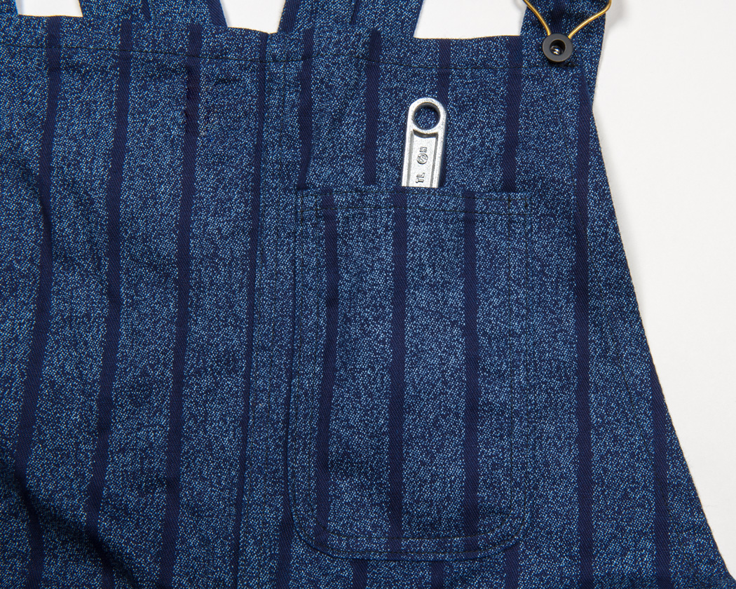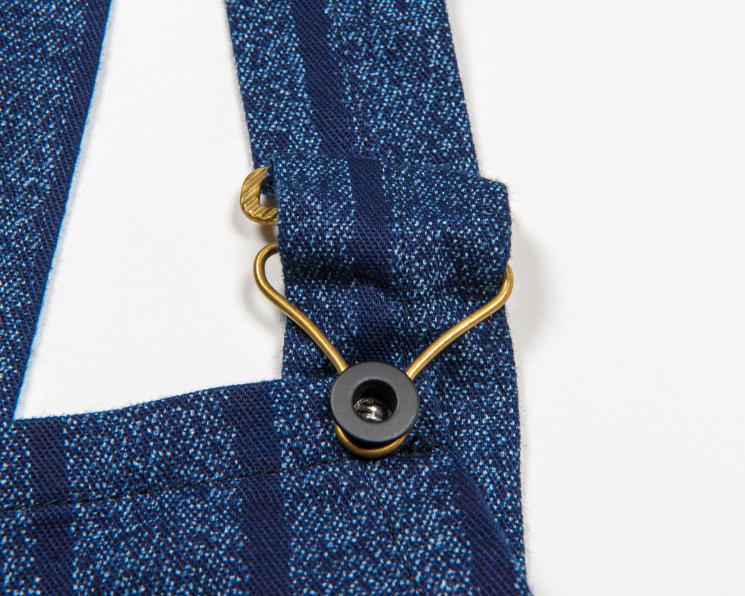 肩ひものサイズ調節は、このバックルにかけるだけ。先はとがっています。通常のバックルに比べればずれやすいのは事実です。それでも、古いオーバーオールと言えばおなじみのバックル。