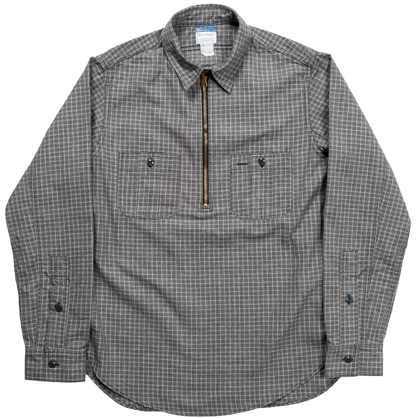 ビンテージを参考に、ハーフジップのワークシャツを。台襟の小型のチンストラップといった、ハーフジップシャツらしいディテールを再現しつつ、ジッパーの年代想定に合わせて袖の仕様はよりクラシックな2ピースにしています。