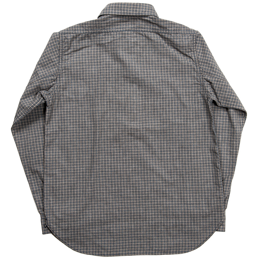 生地屋さんが、古いワークシャツの生地を見て作った綾織りのチェック生地。グレーの杢に白・ブルーで格子が描かれています。