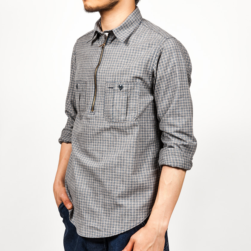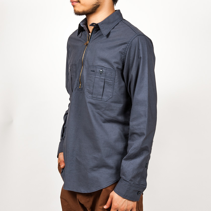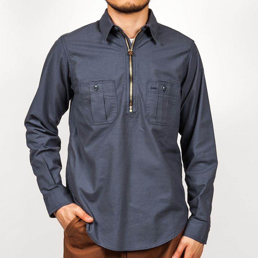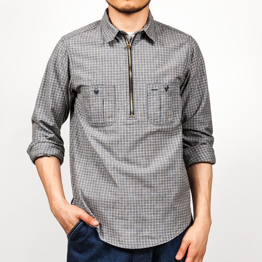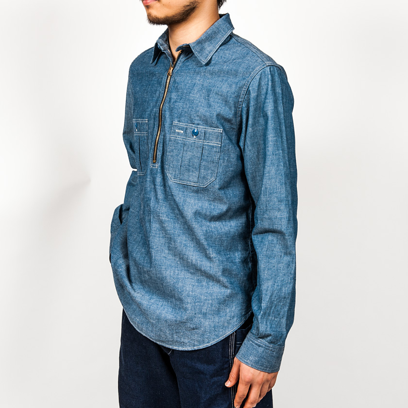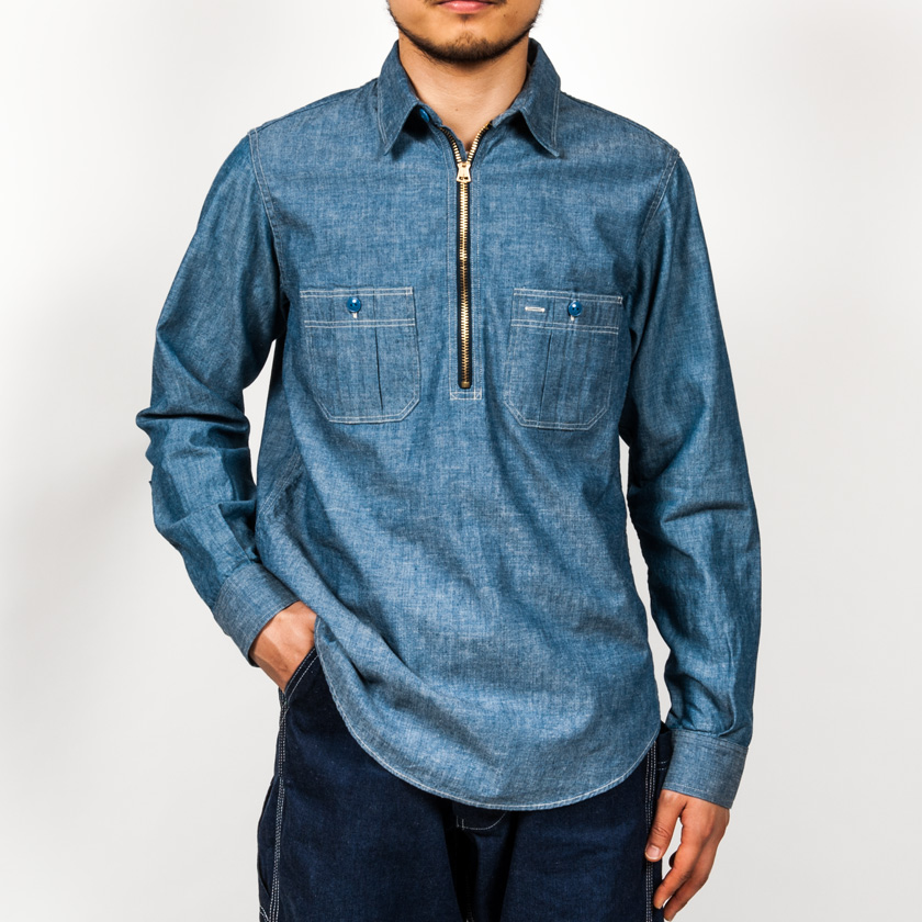 ハーフジップワークシャツ。まず、シャンブレーは15.5サイズを着用しています。
