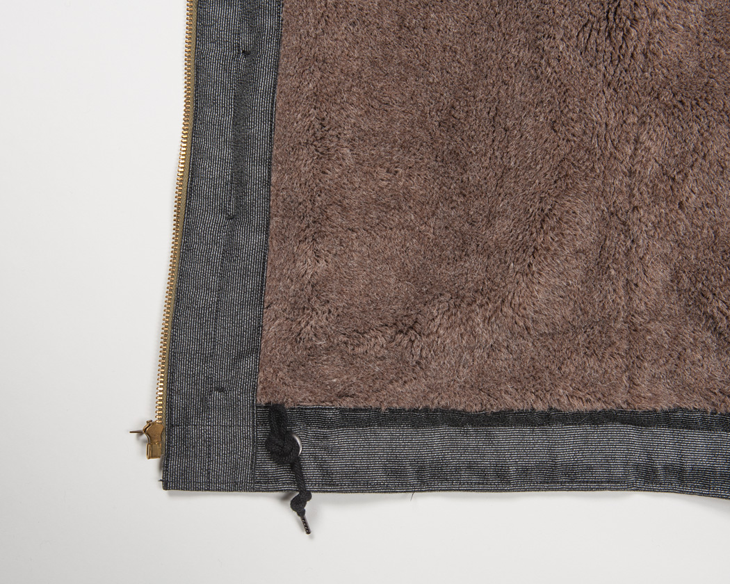 量産は仕様変更しています。弊社サンプルをしばらく着用したところ、脇カンヌキで確かに表・裏は止まっているのですが、袖を通したときにストレスがかかり裂けそうになりました。そのため、量産ではカンヌキは無しにしています。