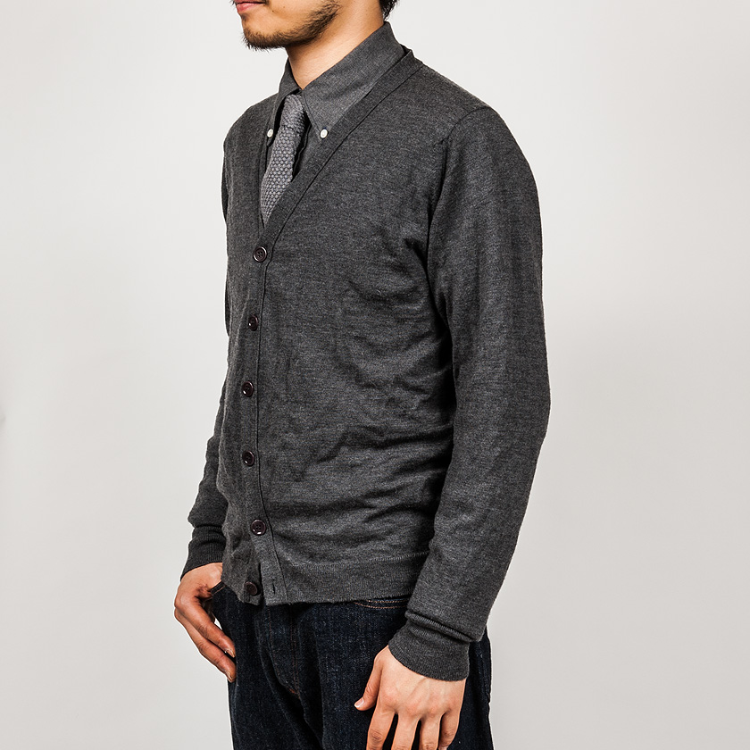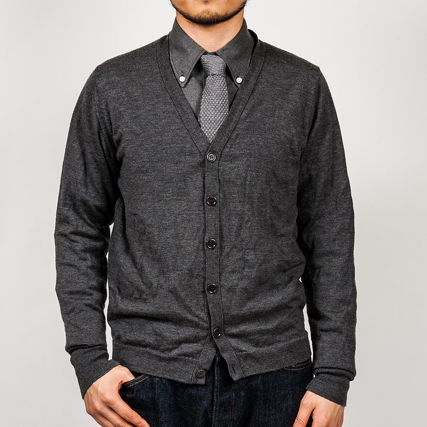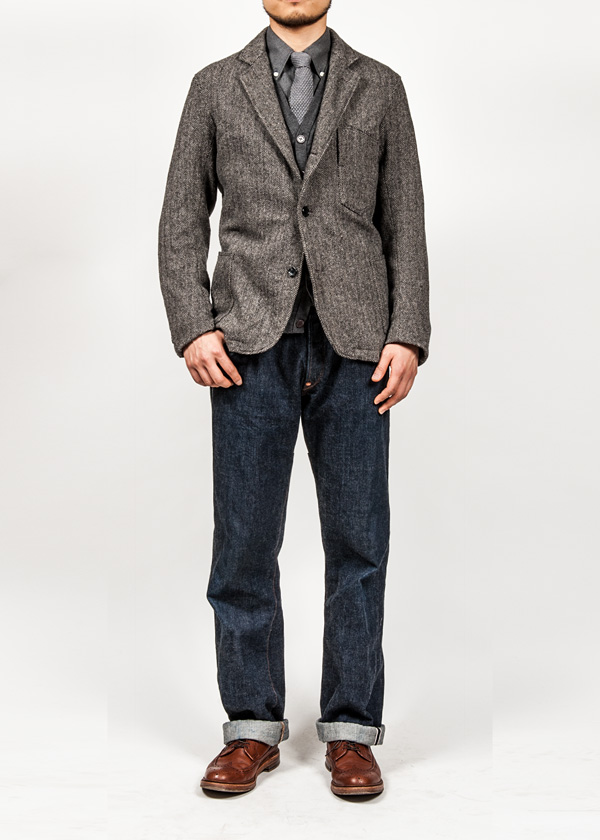 グレー系のグラデーションにジーンズ。なので、足元は茶のロングウィングチップ。これに薄手のコートを着れば、東京以西は真冬もまず大丈夫。