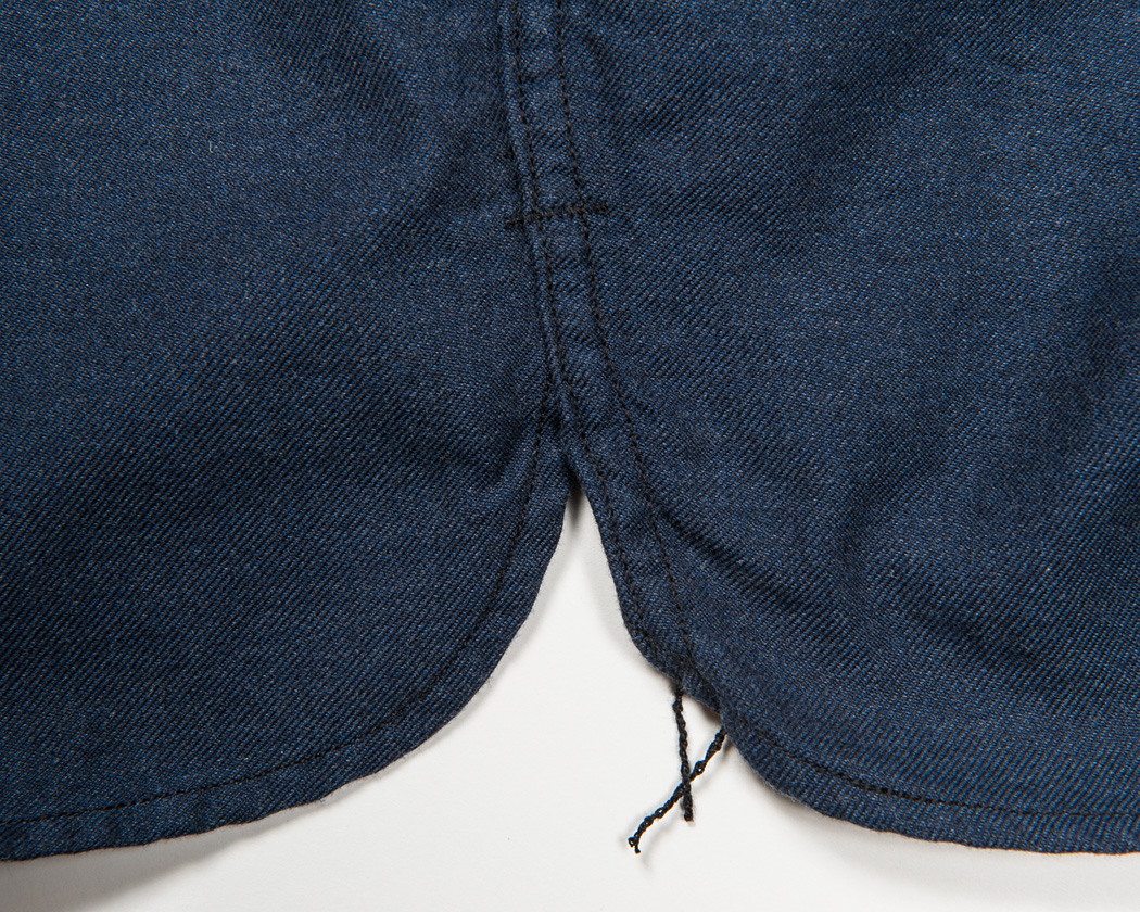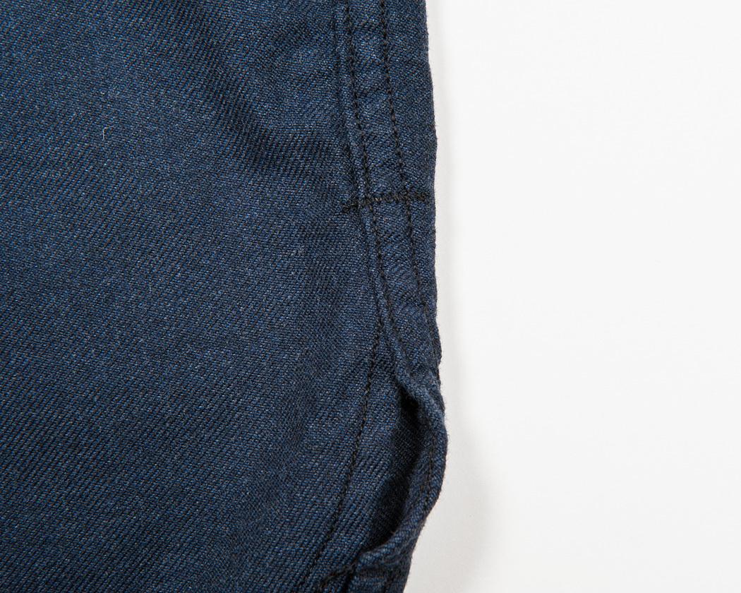 脇にマチはなく、縫い終わりはそのまま流し、ほつれどめのカンヌキを打っています。