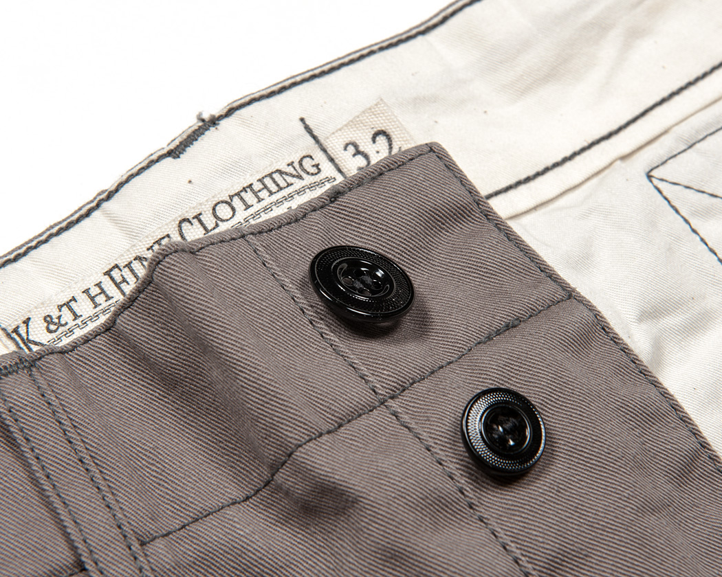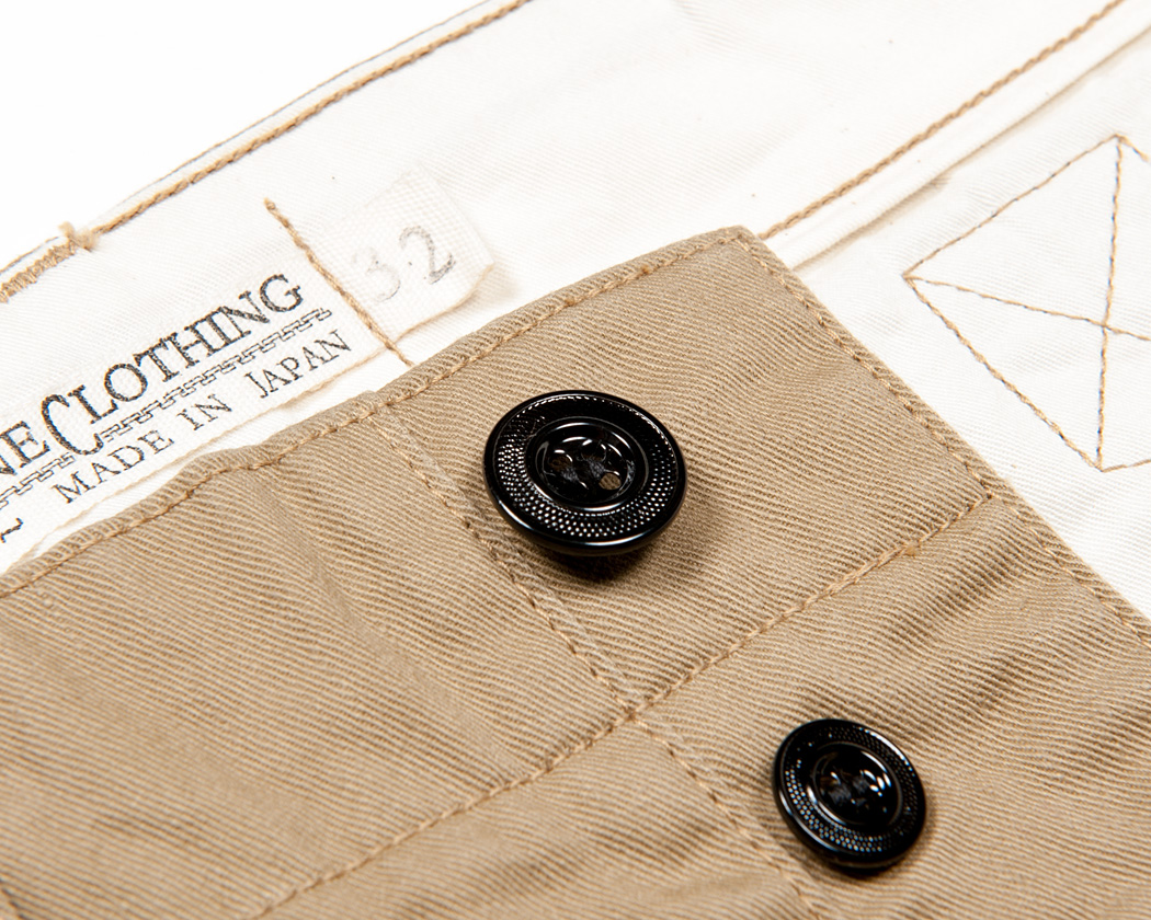 今回のトラウザー、大きな特徴の一つ。真鍮のメタルボタンです。