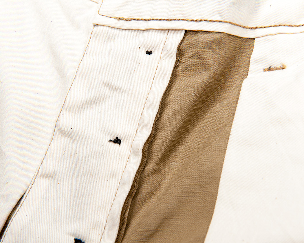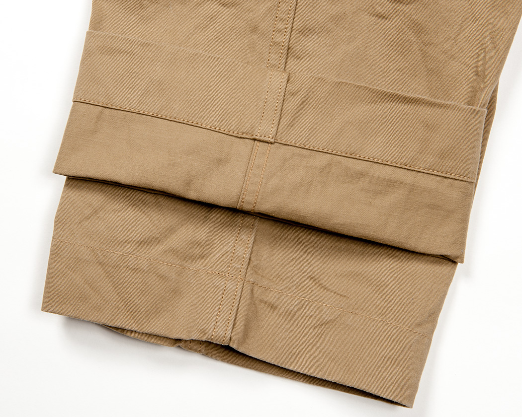 裾はシングルステッチ始末。脇・内股は巻き縫いのチェーンステッチです。