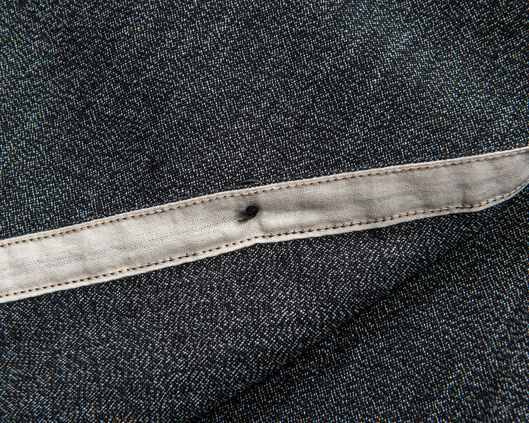 ボタンが付く側。こちらは、チューブ状に別布をあて、表から多本針ミシンで縫います。