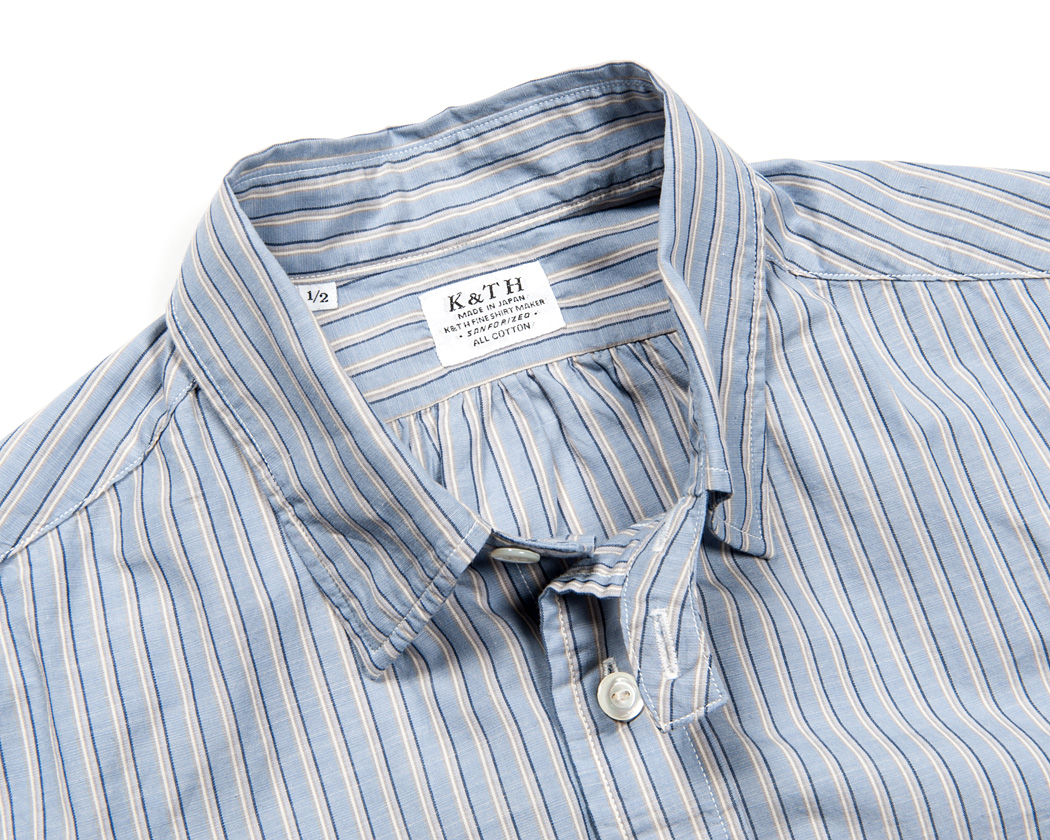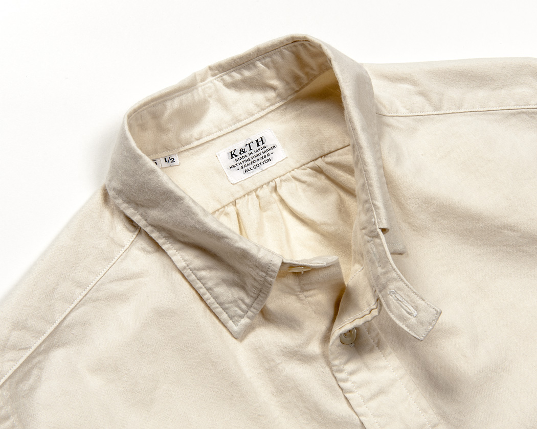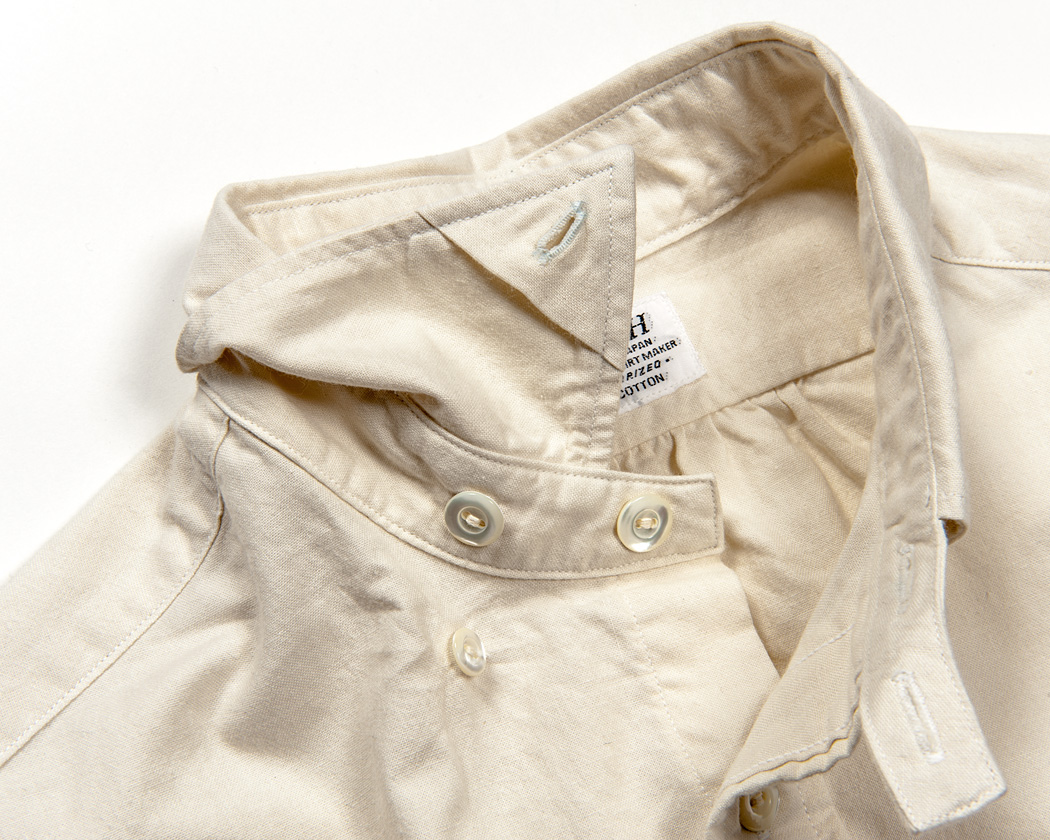 上は隠しBDをしめている状態。襟が身頃に止まっているので、おさまりが良い、しかしBDのようなボタンが見えない。台襟のボタンをあけてきて様になる襟です。