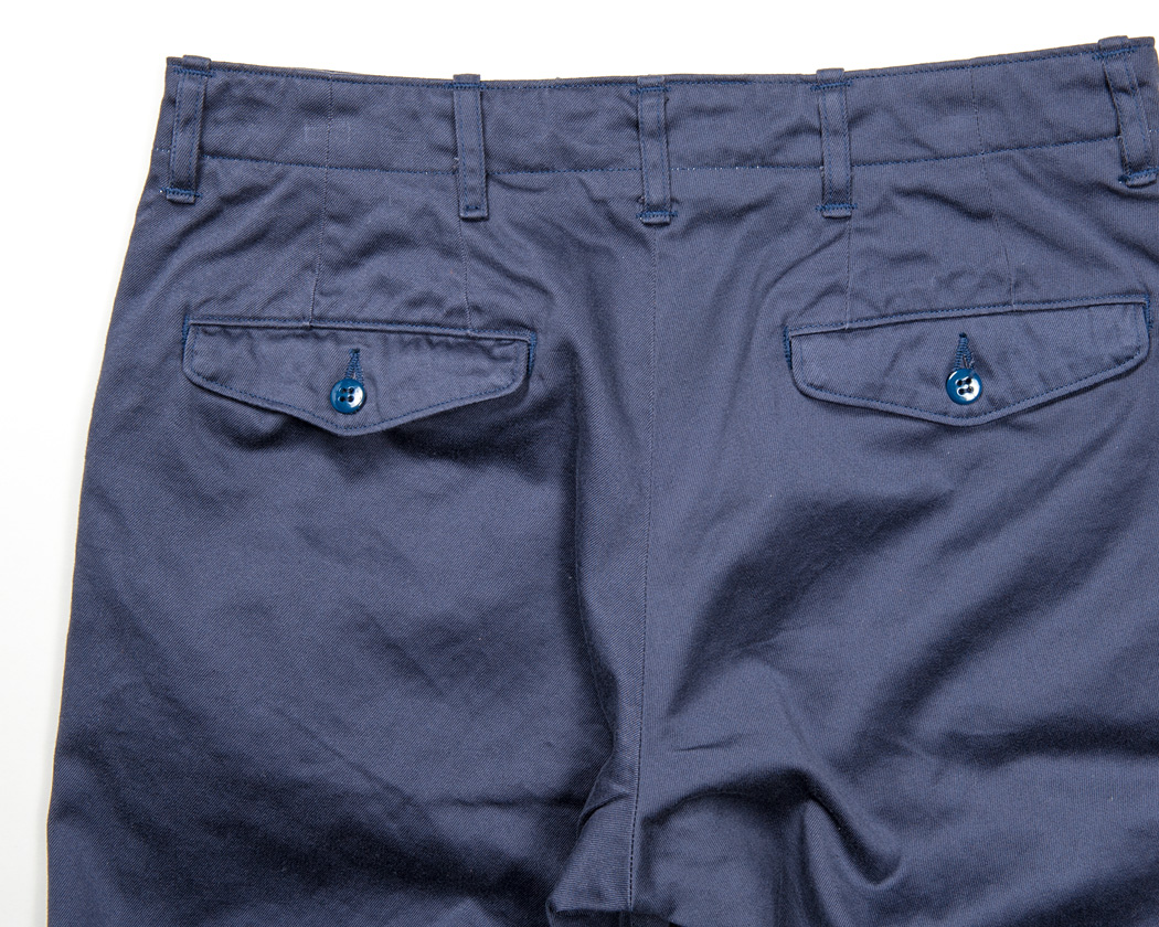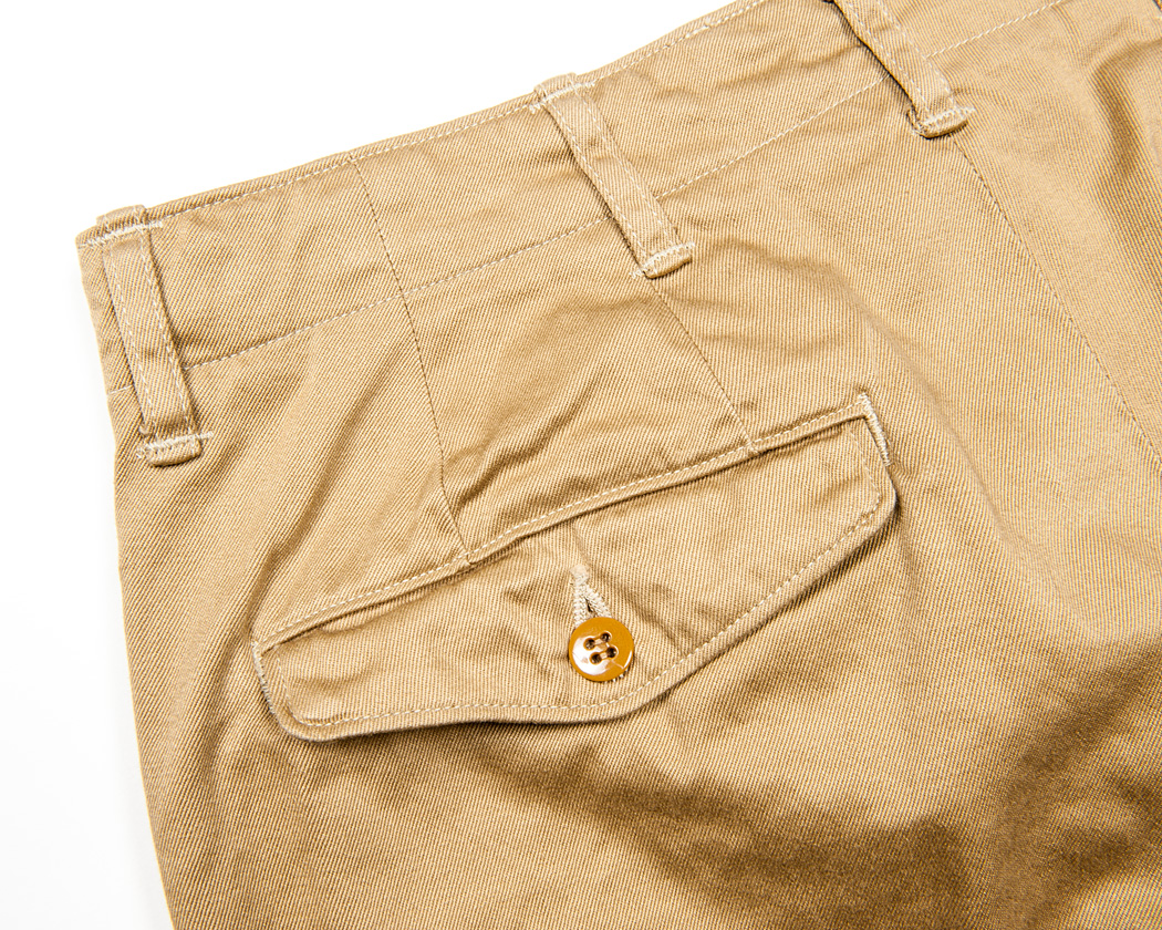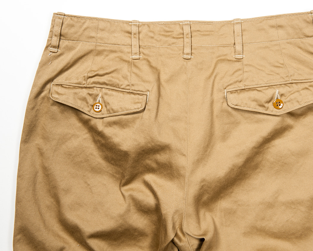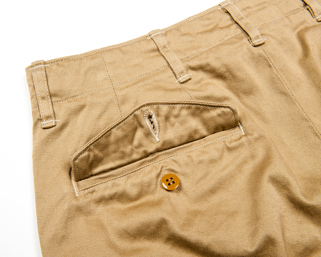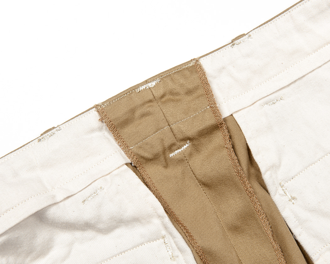 腰裏のスレキは平ミシン始末。Workersのトラウザーズといえば環縫いの始末がおなじみですが、あくまで製品ごとに似つかわしい仕様を選ぶ際、今まではたまたま環縫い始末が多かっただけです。ということで、今回はオリジナル同様シングルステッチ始末にしています。