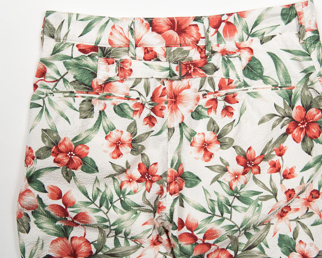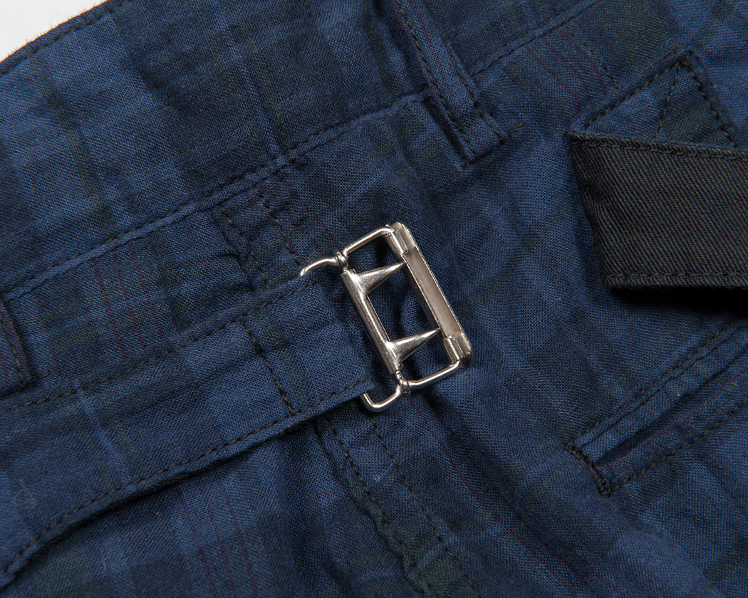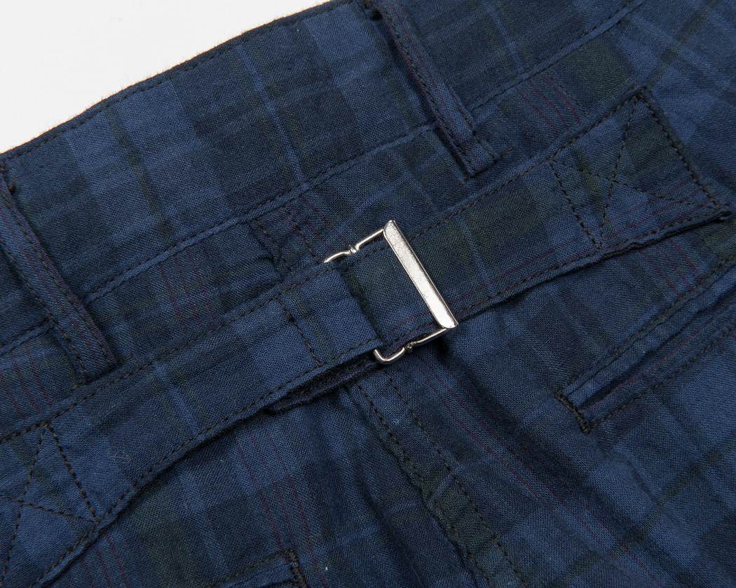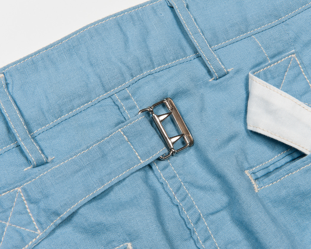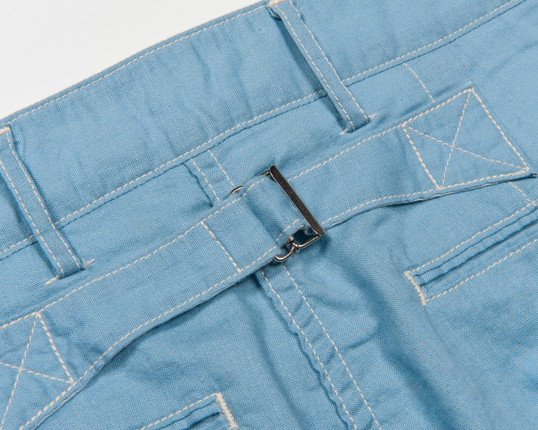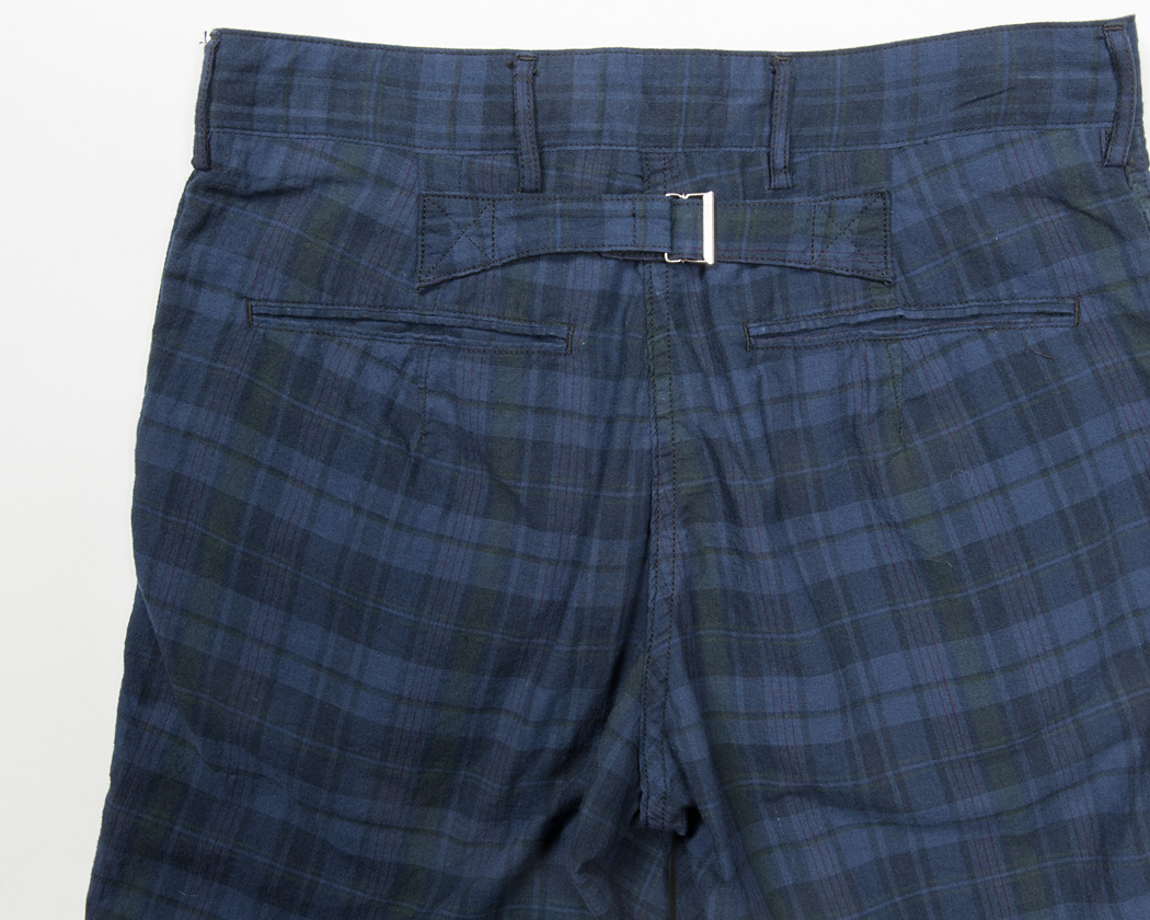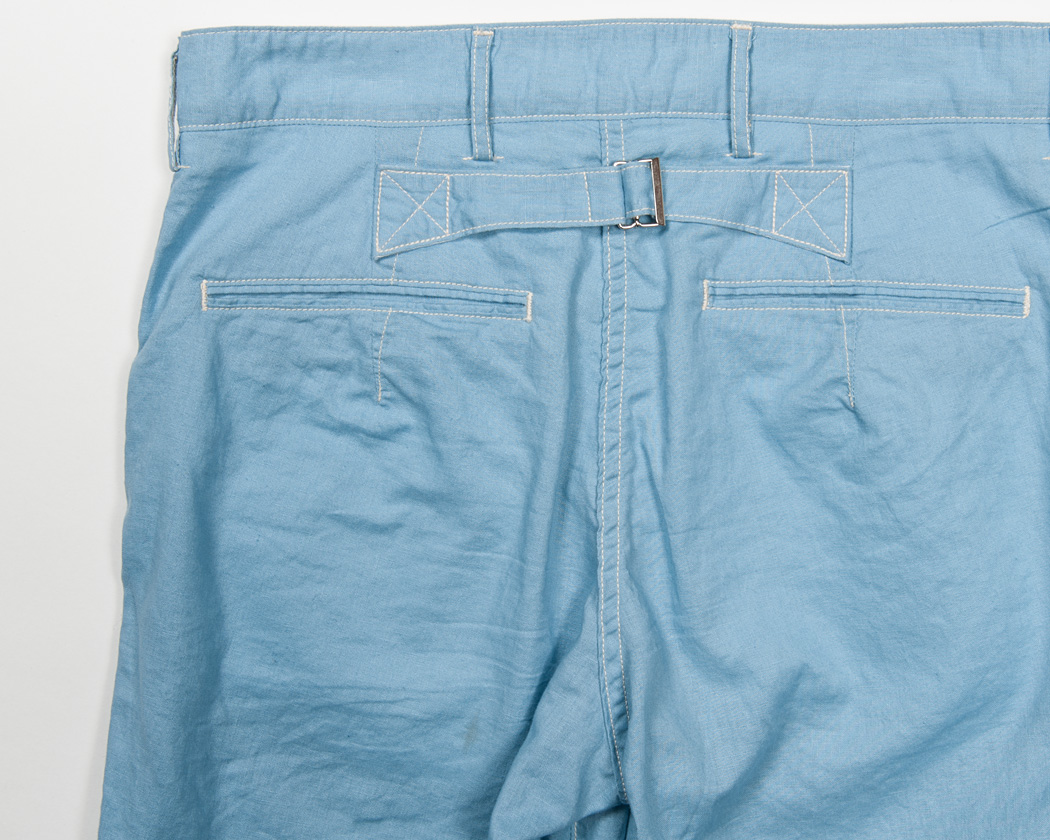 細玉ぶちに深いダーツ。シルエットはBuckle Back Trousersの腰回りと同じ。バックシンチの形状は、これまた古いBrooksのトラウザーズ を参考にしています。