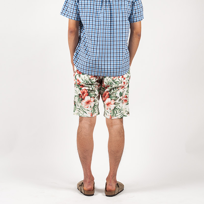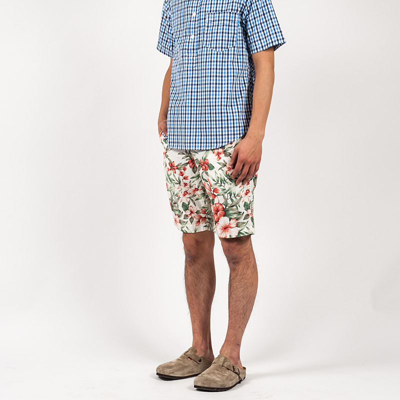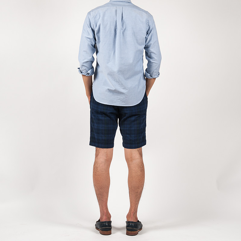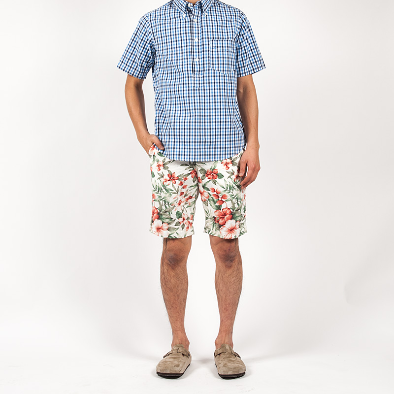 Buckle Back Shorts。リアルに長袖の袖まくり、それに柄×柄の半そでを合わせて。