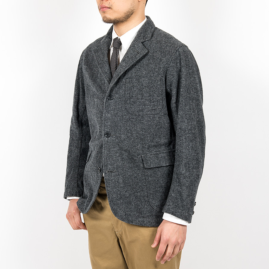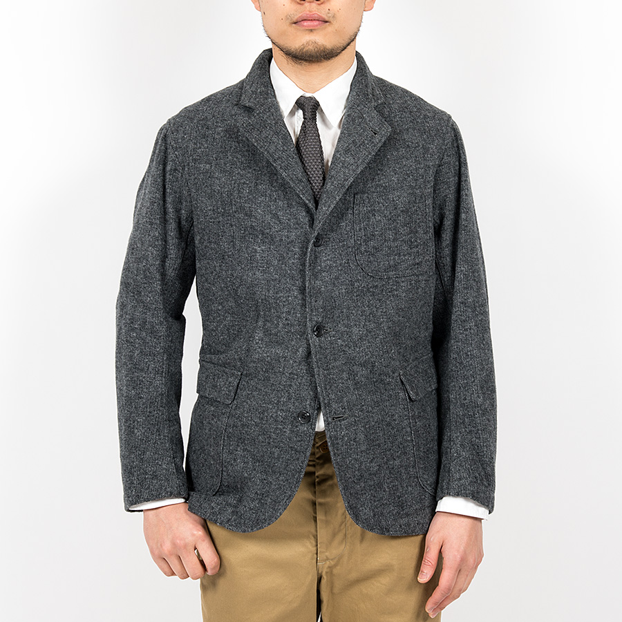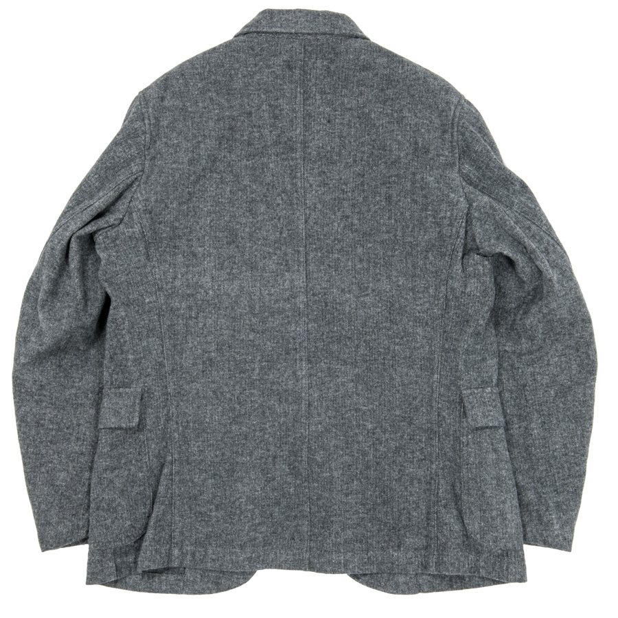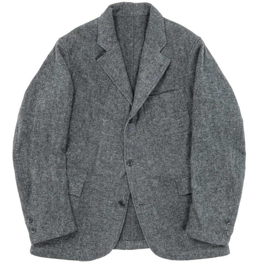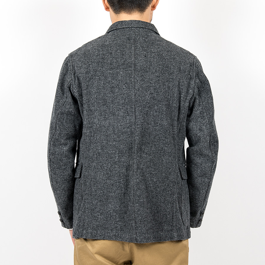 「コットンでウールライクな表情を」ということで、双糸(糸を二本よった)使いでヘリンボンを織り生地厚を出す。さらに、それを起毛することでこの独特な表情が出ています。そのままだと着脱ぎの時に少し引っかかりがあるので、袖にキュプラの裏地をつけています。