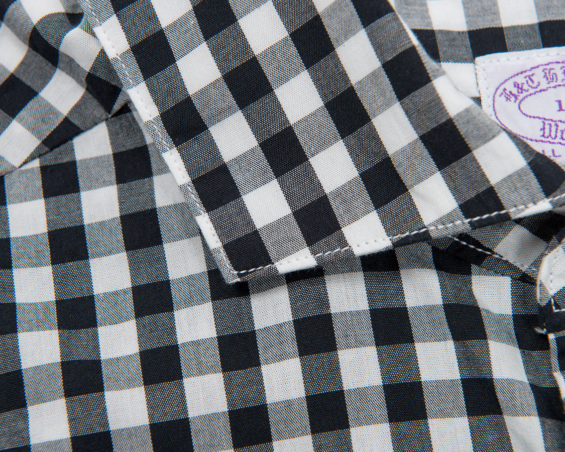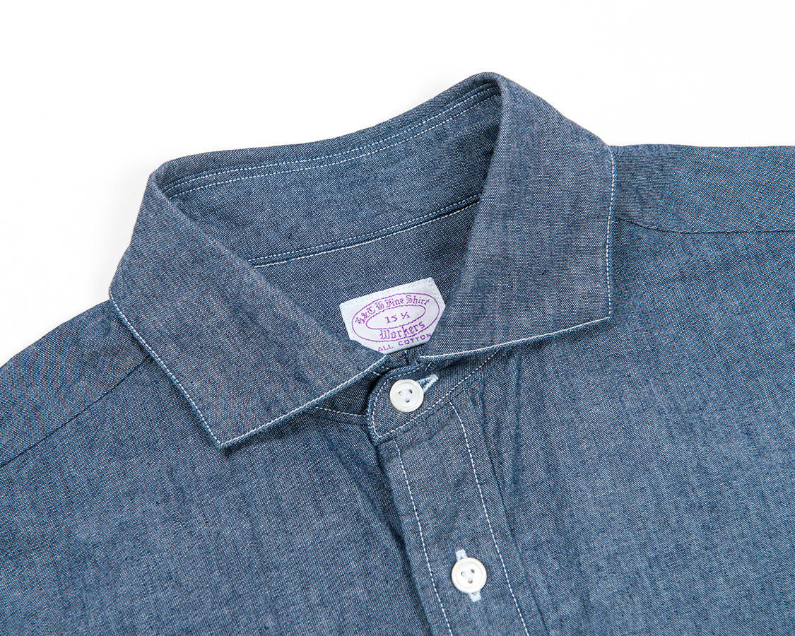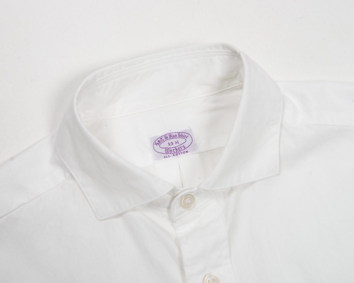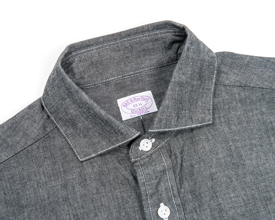 また、WORKERSのシャツは台襟下、身頃の第一ボタンを意識的に上気味にしています。ネクタイをしないで、台襟のボタンをはずしても左右に開きすぎないのが特徴です。 |