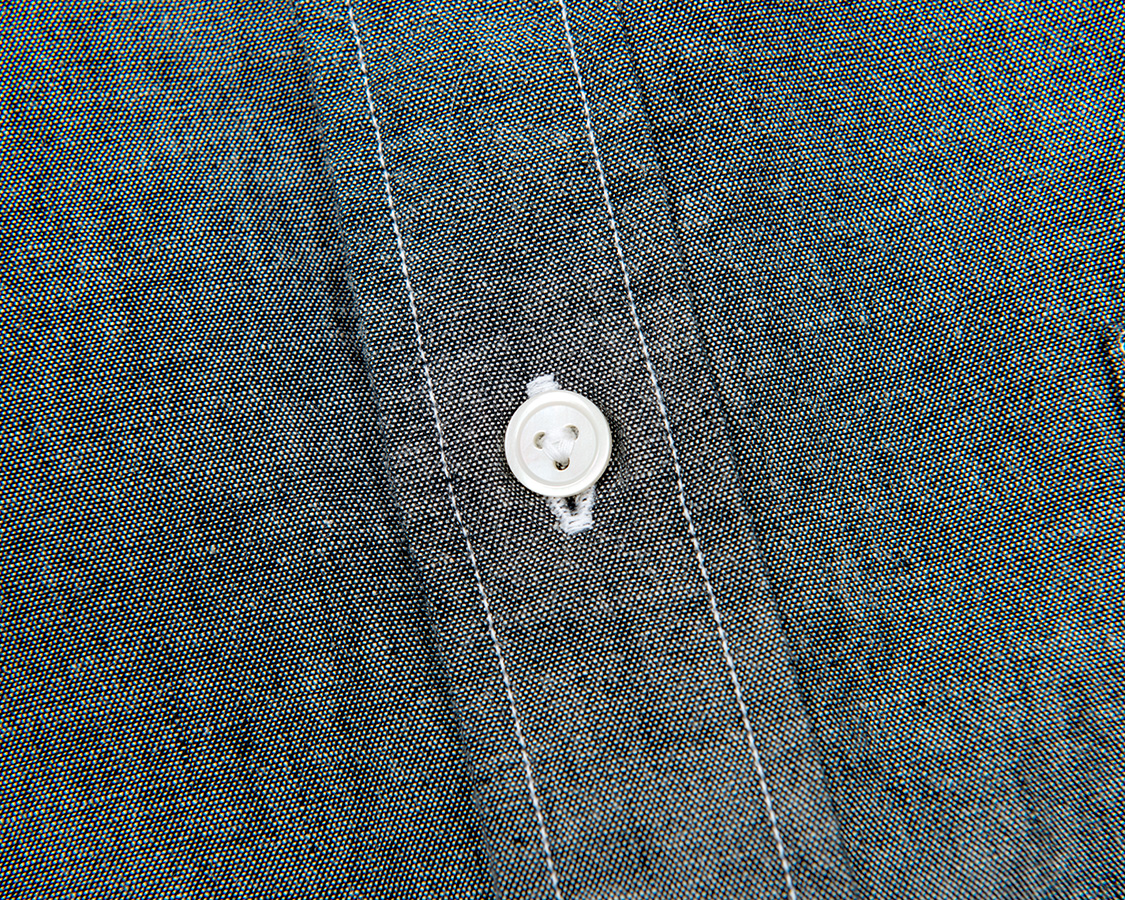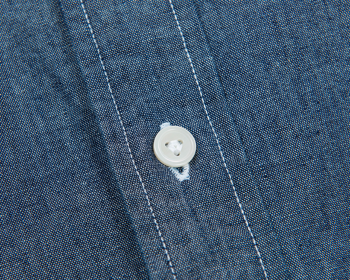 ボタンはハサウェイよろしく三つ穴ボタン。前立ては乗せ前立てで、チェーンステッチ二本針で一気に縫い上げます。