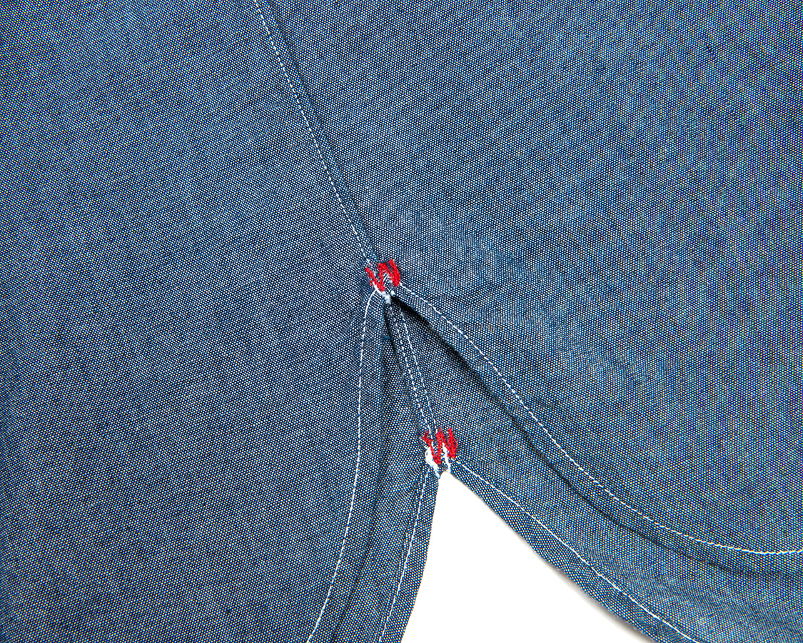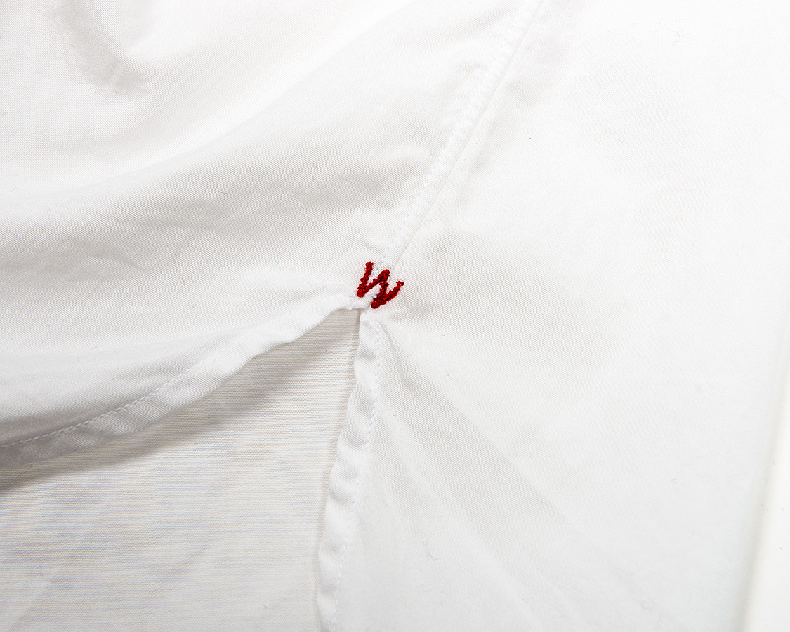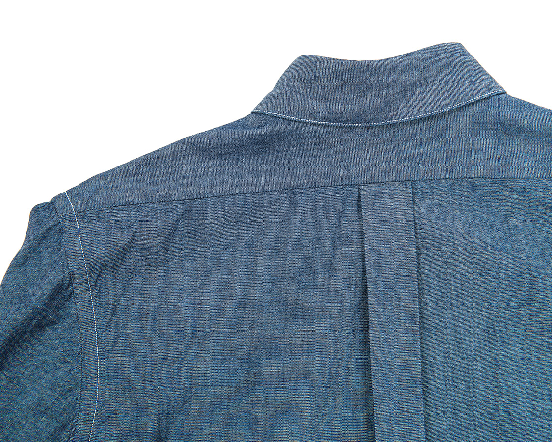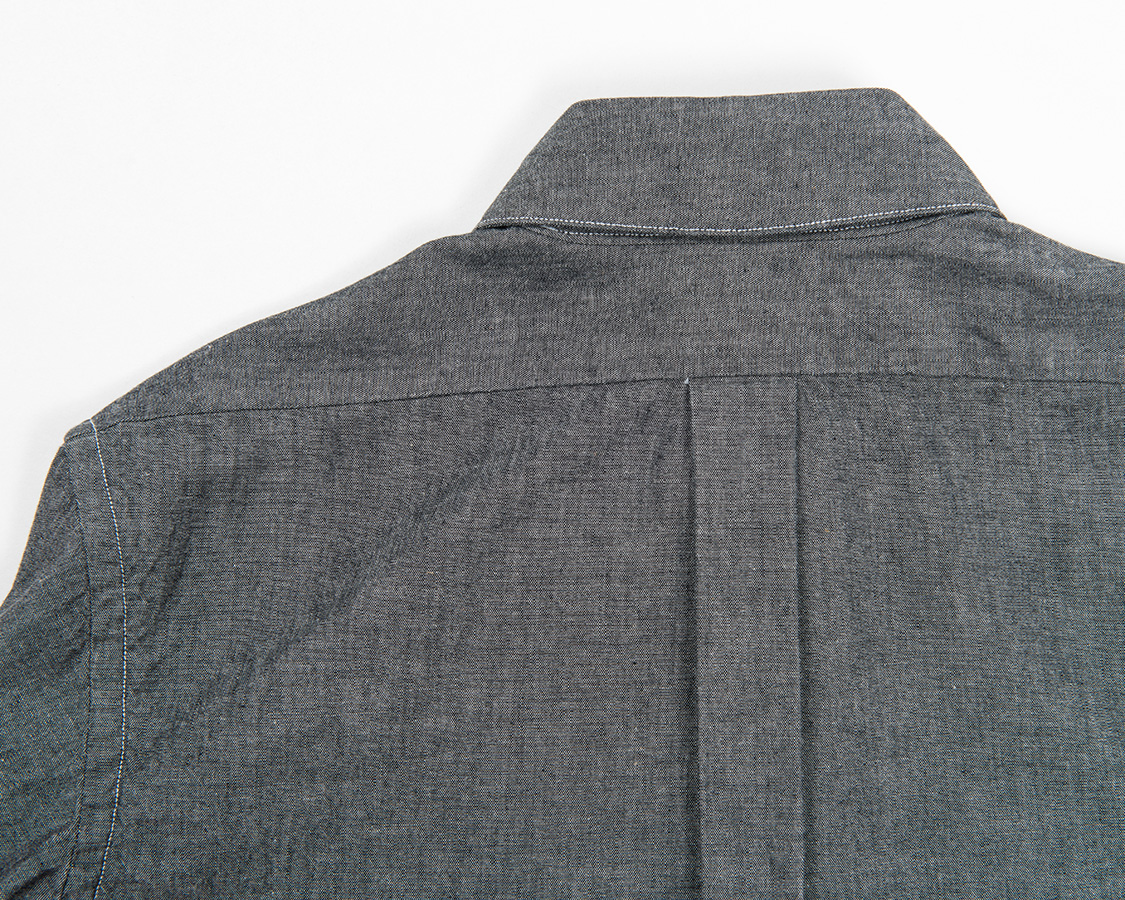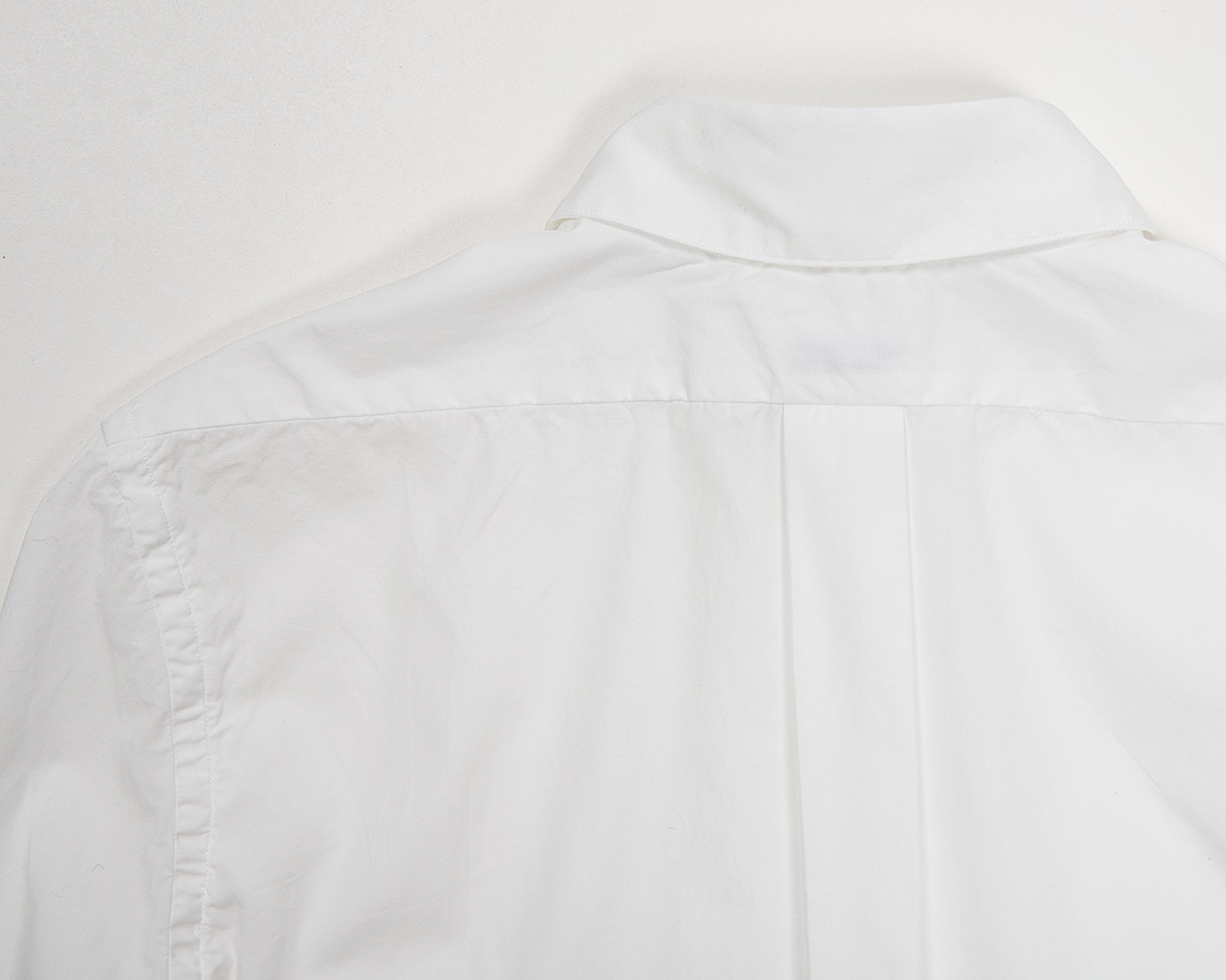 背中側もステッチの無いヨーク始末。身頃中心にはたっぷりとタックが入っています。これが、腕を動かしたときなど、ゆとり・運動量として使われます。