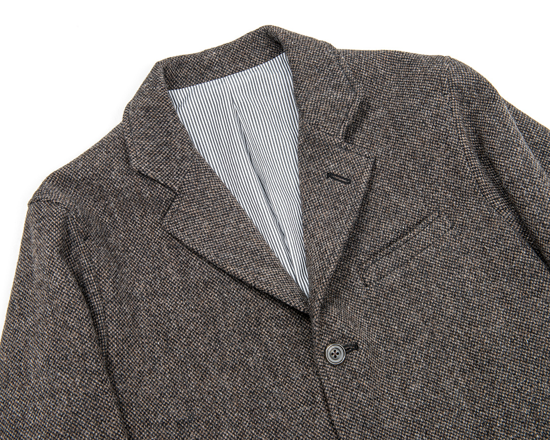 ホームスパンツイードの生地アップ。タテ糸にブラウン/グレイ、それぞれの色糸を使いヨコ糸にブラックの糸を打ちます。それぞれ、二本づつ引き揃えての平織。生地に厚みとふっくらした風合いを出してくれています。